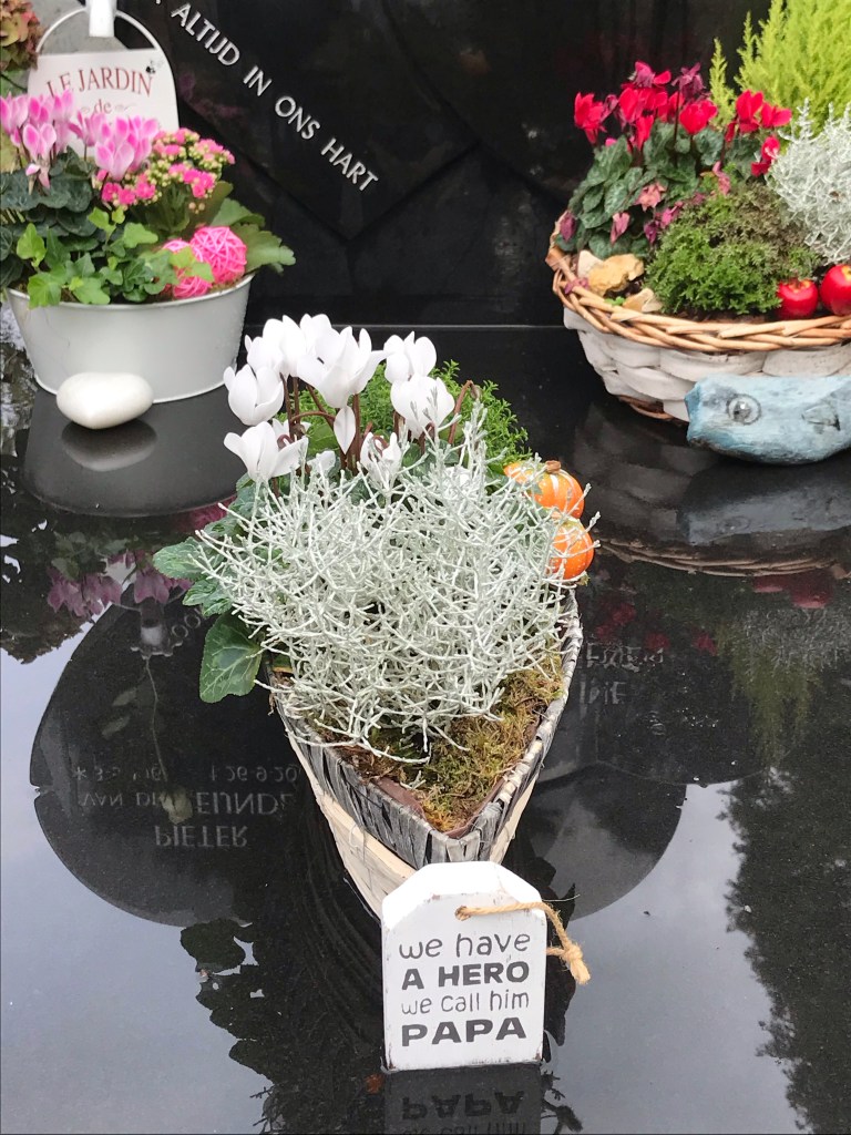 Gisteren gingen Michael en ik bloemen kopen voor op het graf. De andere kids bleven braaf in de auto ivm de Corona regels. We hadden twee mooie stukken in onze winkelwagen liggen toen we dit houten hangertje zagen bij de kassa. Ja, die konden we niet laten hangen natuurlijk. Pieter was (is) hun held hun grote voorbeeld: nooit opgeven, vechten voor iedere dag dat hij langer bij ons kon zijn. De arts in het ziekenhuis was zo verbaasd dat Pieter al die tijd gewoon naar boven ging en bij mij sliep. Dat hij vrijdags gewoon eitjes voor ons had gebakken. Hij zei dat heeft uw man puur op wilskracht gedaan. Ik zei:”u noemt dat wilskracht, ik noem dat pure liefde “. Hij woog vroeger tegen de 100 kilo maar op het laatst maar 35😞. En hoe moeilijk het ook was in het ziekenhuis schreef hij nog: ik geniet van iedere dag.