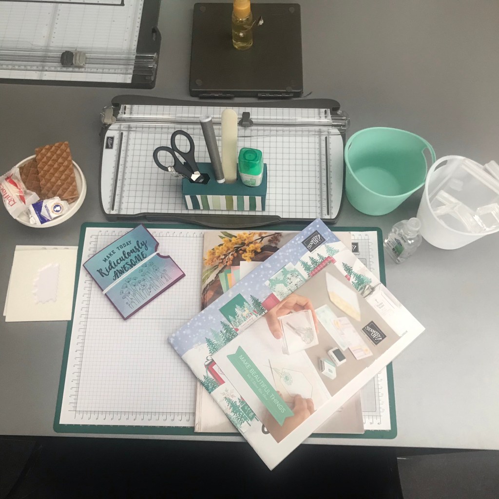 Zo zag hun werkplek eruit. Iedere dame haar eigen tombowstation met Papersnips en Bonefolder en Pick Up Tool.