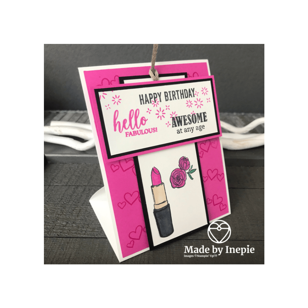 Ik heb de leuke stempelset Dressed to Impress gebruikt. Het cardstock in Magenta Madness knalt er echt uit. De ontvangster was er erg blij mee. Zij is District Manager van Oriflame dus een toepasselijke kaart zo met die lippenstift.