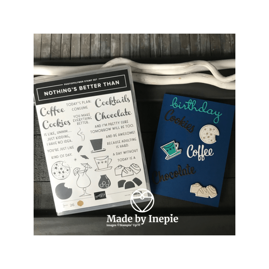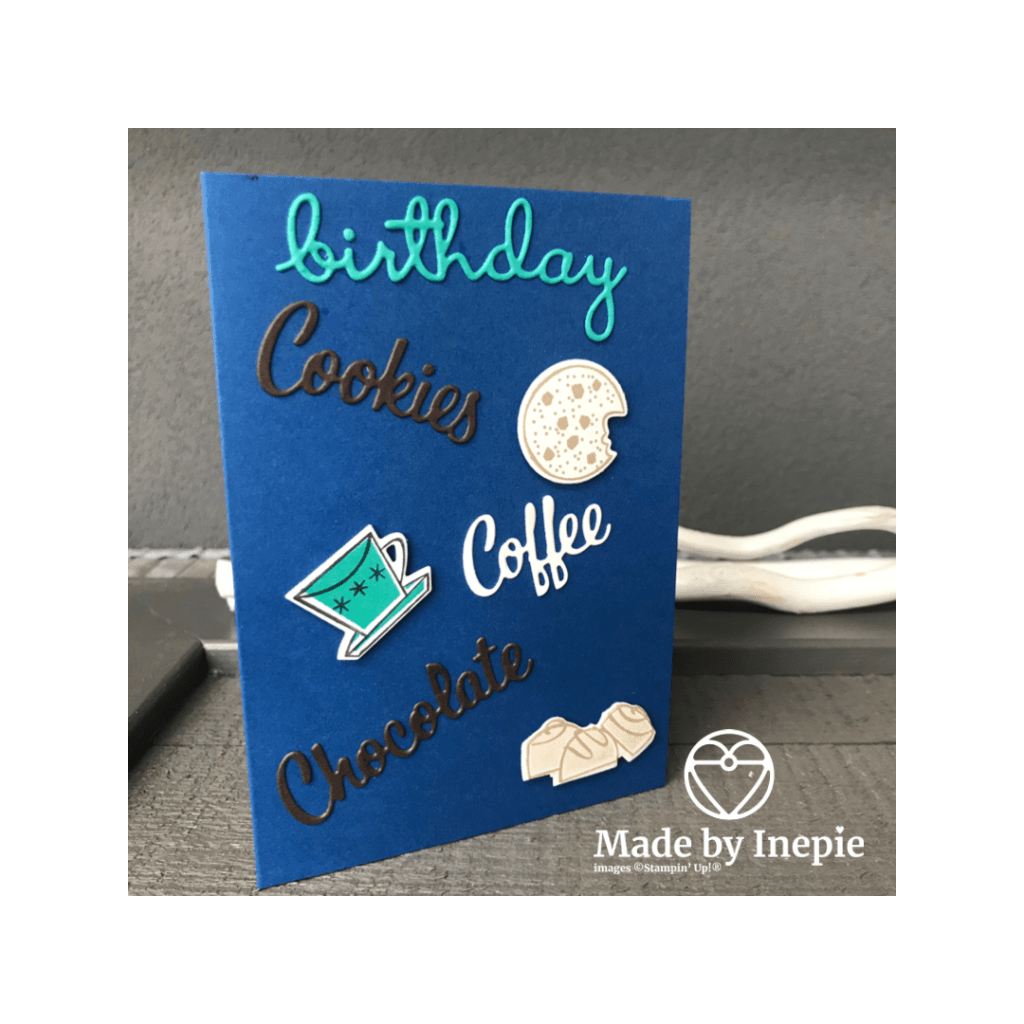 Met de bijbehorende stempelset heb ik de koekjes, kopje en chocolade gestempeld en uitgestanst. En dit alles speels op een basiskaart geplakt. Ook dit was een opdracht kaart voor een jarige man die gek is op: koffie, koekjes en chocolade ✅