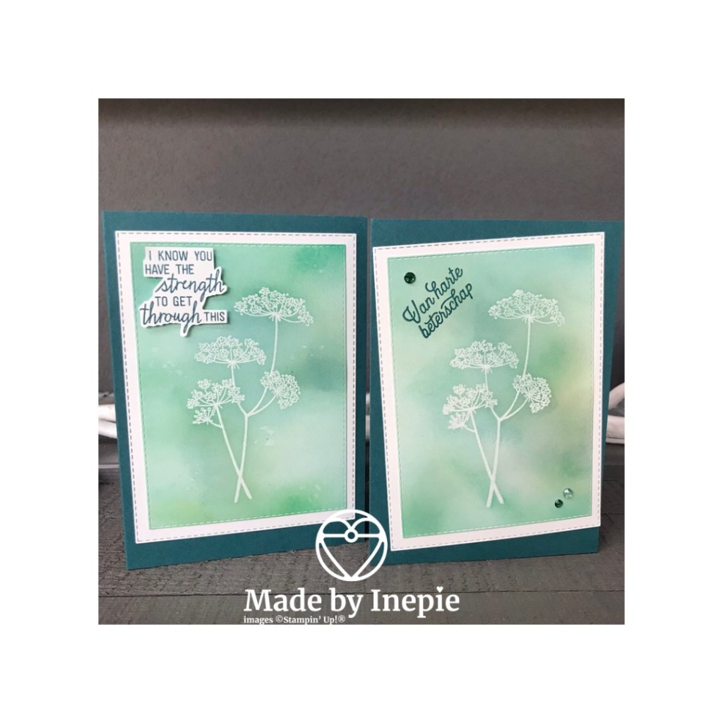 De kaartjes die ik vandaag laat zien heb ik een tijdje terug al gemaakt. Met de mooie set Queen Ann lace.Eerst de bloemen ge-heat embossed en daarna lekker zitten sponsen. Dat geeft zo’n mooi effect. Zo’n kaartje heeft dan niet veel meer nodig: een tekst en wat bling bling. De ene kaart netjes recht geplakt en de andere juist a-symmetrisch.