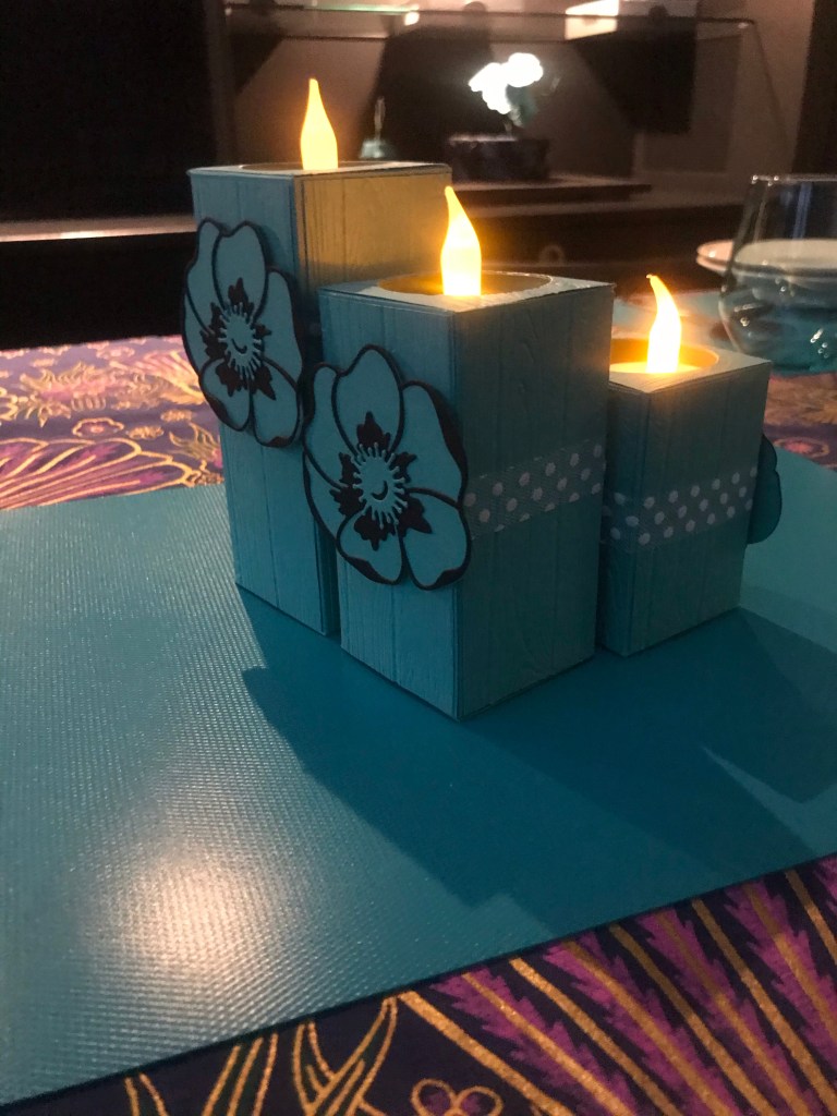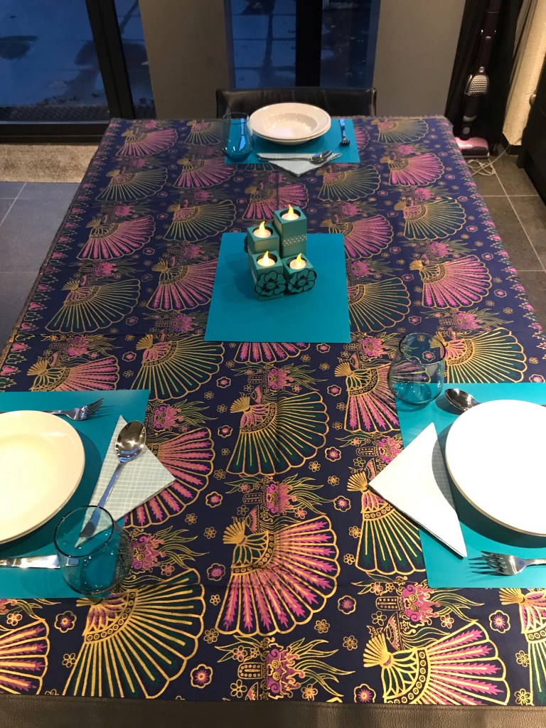 Ik heb de tafel gedekt met een stuk Batik want ik heb indisch gekookt: Soto, Babi Ketjap en Frikadel Pan en wok groenten. En het Bermuda Bay van de zelfgemaakte kandelaars past perfect bij de glazen en de placemats: hier word ik blij van.