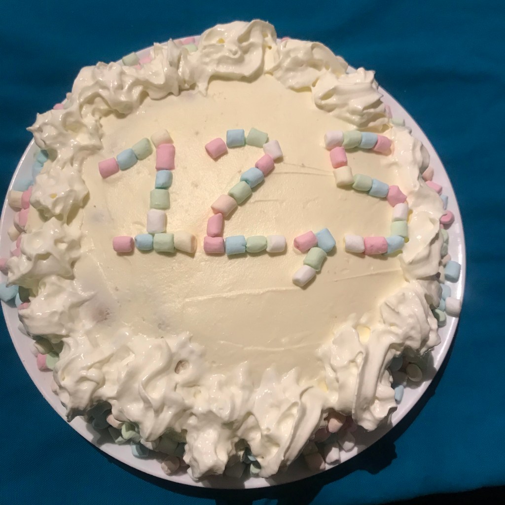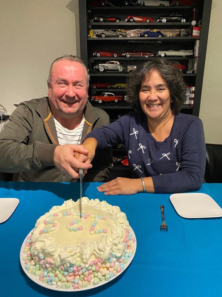 Vandaag zijn we 12,5 jaar een setje. En 12,5 jaar een samengesteld gezin. Zaterdag hadden we eten besteld maar het toetje werd gemaakt door Nick en Bibi. Het was een verrassing dus maar goed dat we gingen fietsen. We moesten na het eten onze ogen dicht doen en toen stond er deze prachtige zelfgebakken taart op tafel. Super lief en lekker!
