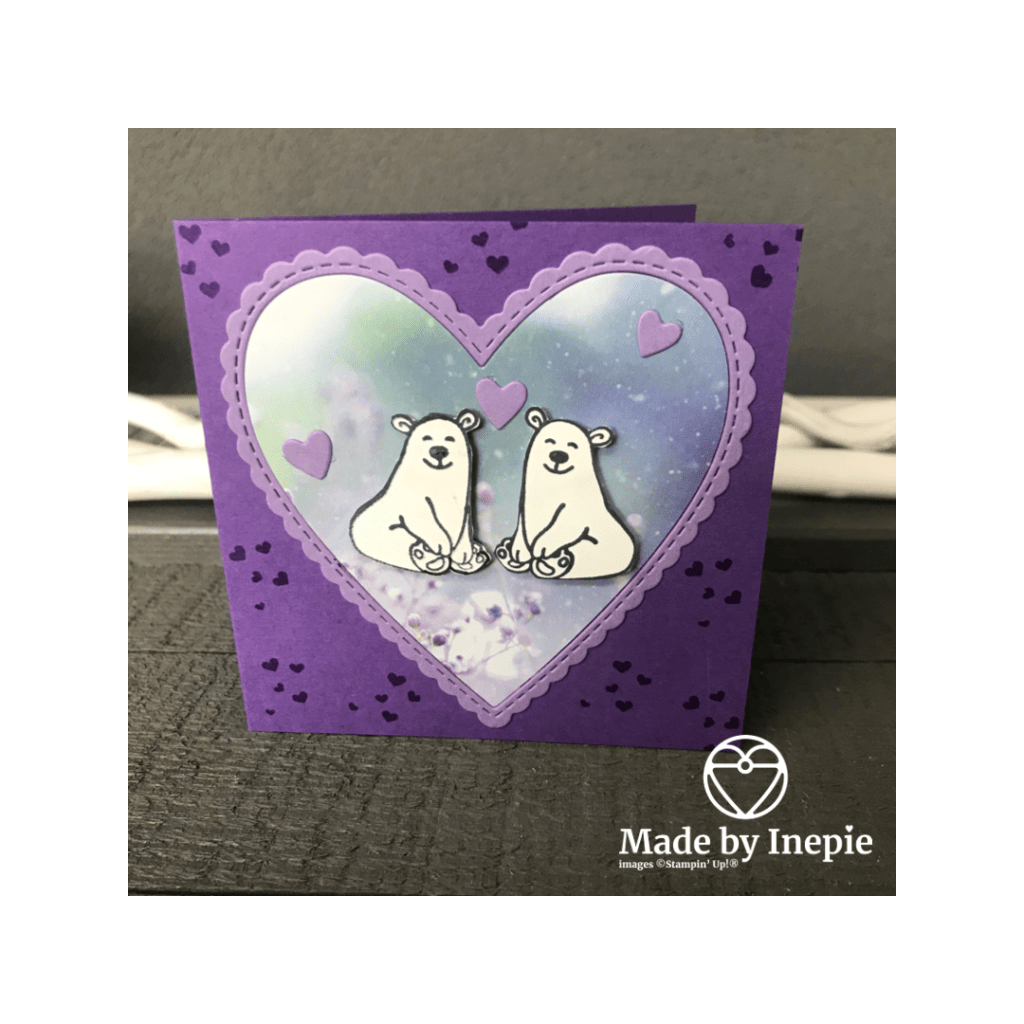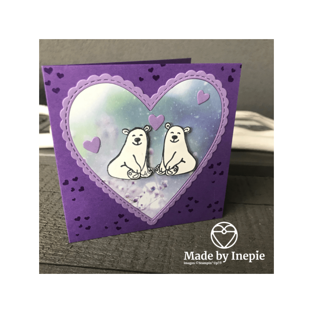 Natuurlijk hoort er op deze dag een zelfgemaakt kaartje bij. Is het geen schatje? Het ijsbeertje komt uit de Warm & Toasty stempelset en heb ik 1 keer gespiegeld gestempeld met behulp van mijn Stamparatus en een silicone mat. Willem vond hem erg mooi.