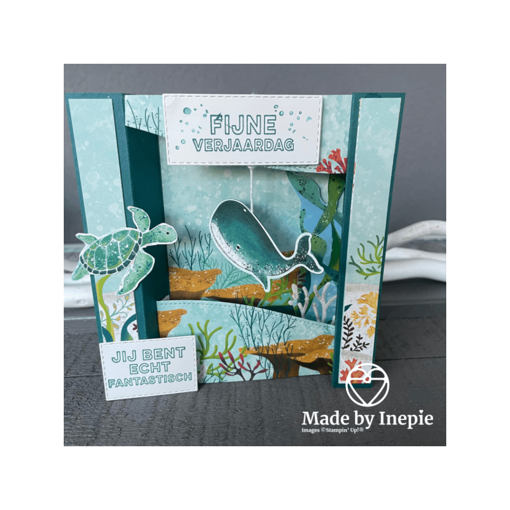 Ik heb de walvis pons gebruikt en het mooie Whale of a Time Dsp. De stitched rectangle Dies en de Freezin Friends Dies voor de mooie stitched ronding. Doordat er gaatjes inzitten kon ik daar mooi de walvis aan hangen. De teksten komen uit de set Volop Vrienden. Alleen de Freezin Friends Dies vallen buiten de kortings actie want die staan in de mini catalogus.