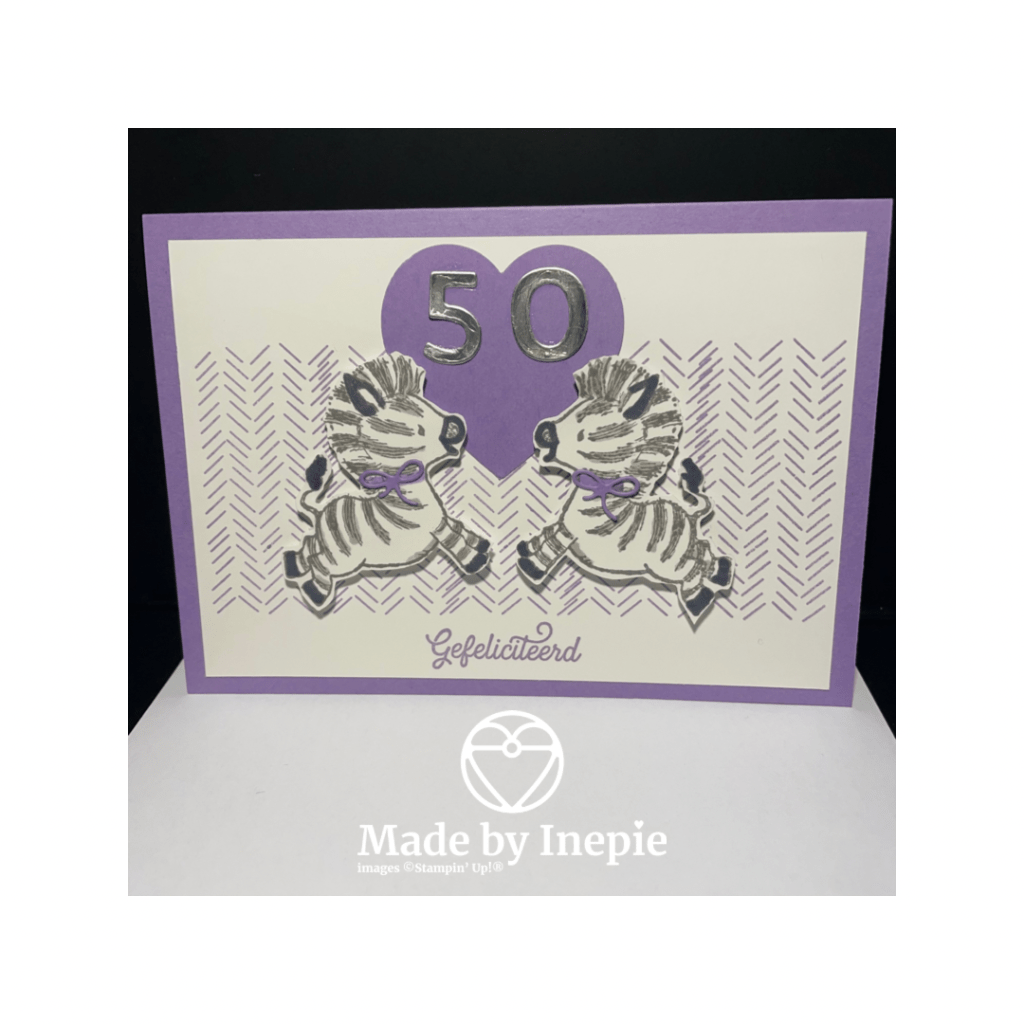 In mijn YouTube filmpje van gisteren heb ik deze achtergrond gemaakt en ik heb hem versierd met 2 zebra’s. De rechter heb ik gespiegeld gestempeld ook met behulp van mijn Stamparatus en de siliconen mat. Een vriendin werd 50 dus daar hoort een leuk kaartje bij.