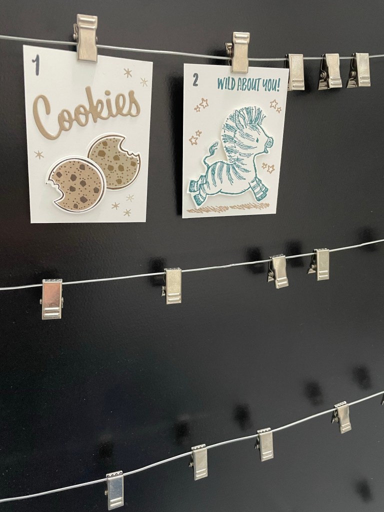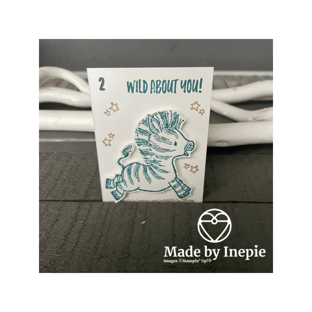 Kaartje 2 is de schattige Zebra uit de Zany Zebra’s stempelset. En ook de tekst en de grond komt uit die set. Ik heb hem gestempeld in Pretty Peacock en uitgeknipt met mijn Paper Snips. Daarna hem opgeplakt met dimendionals. De sterretjes konen ook uit de set en heb ik gestempeld in Crumb Cake. De cijfers die ik iedere dag zal gebruiken komen uit de Make A Difference set.