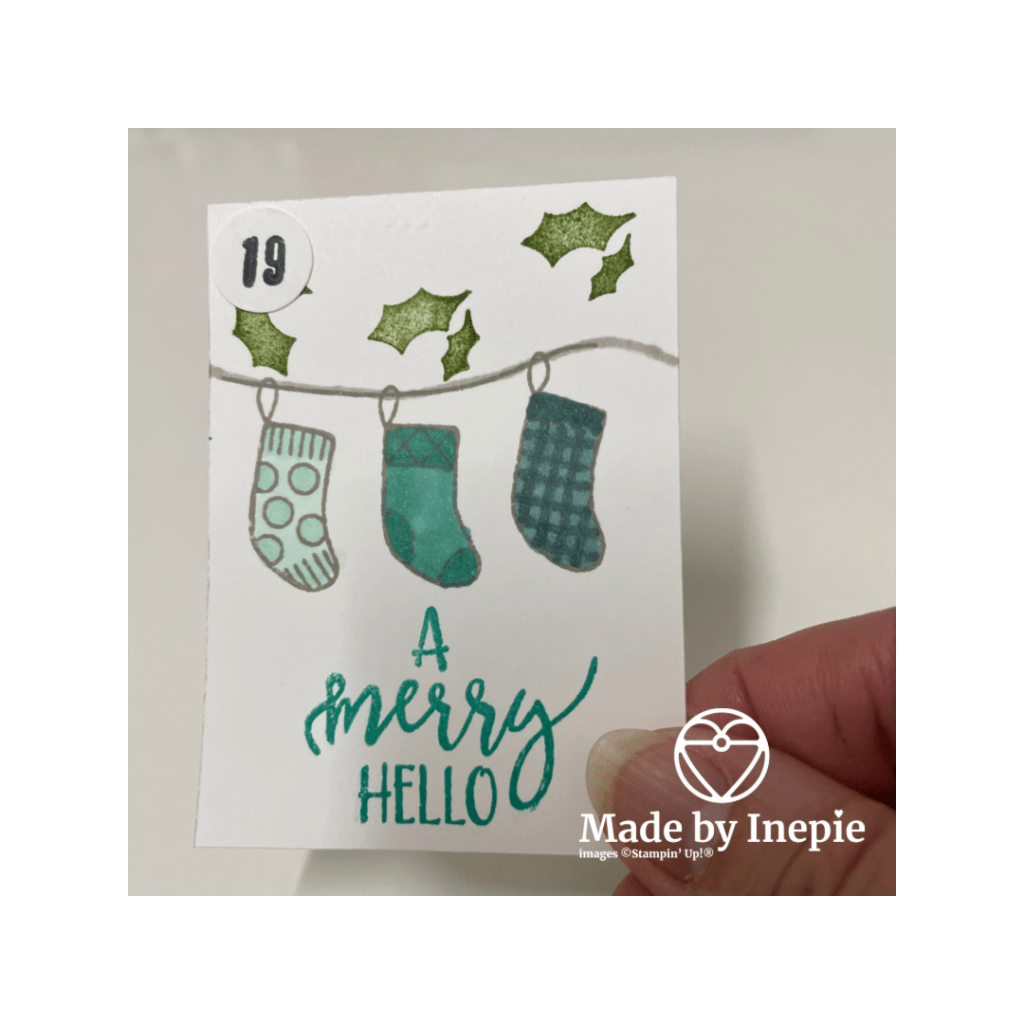 Dus nog even snel dit kaartje gemaakt met de Hostess set A Merry Hello. En de sokken ingekleurd met niet traditionele kerstkleuren.