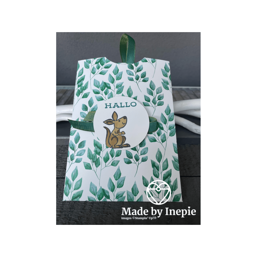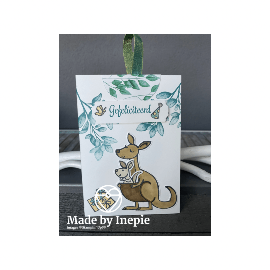Gisteren was niet alleen mijn zoon jarig maar ook mijn vriendin Margriet. Voor haar maakte ik een kaart in een dsp zakje met de super leuke Kangaroo & Company bundle. Stempelset en stansen met 10% korting:€ 44,00. Koop je er het mooie True Love Dsp bij of zoals ik gebruikt heb het mooie Forever Greenery Dsp ( €14,00)en een flesje Tombow Liquid Glue ( €6,00) dan mag je al een gratis product uitzoeken uit de Sab folder. Bijvoorbeeld de ezeltjes of de mooie Nederlandse stempelset Hart verwarmend.