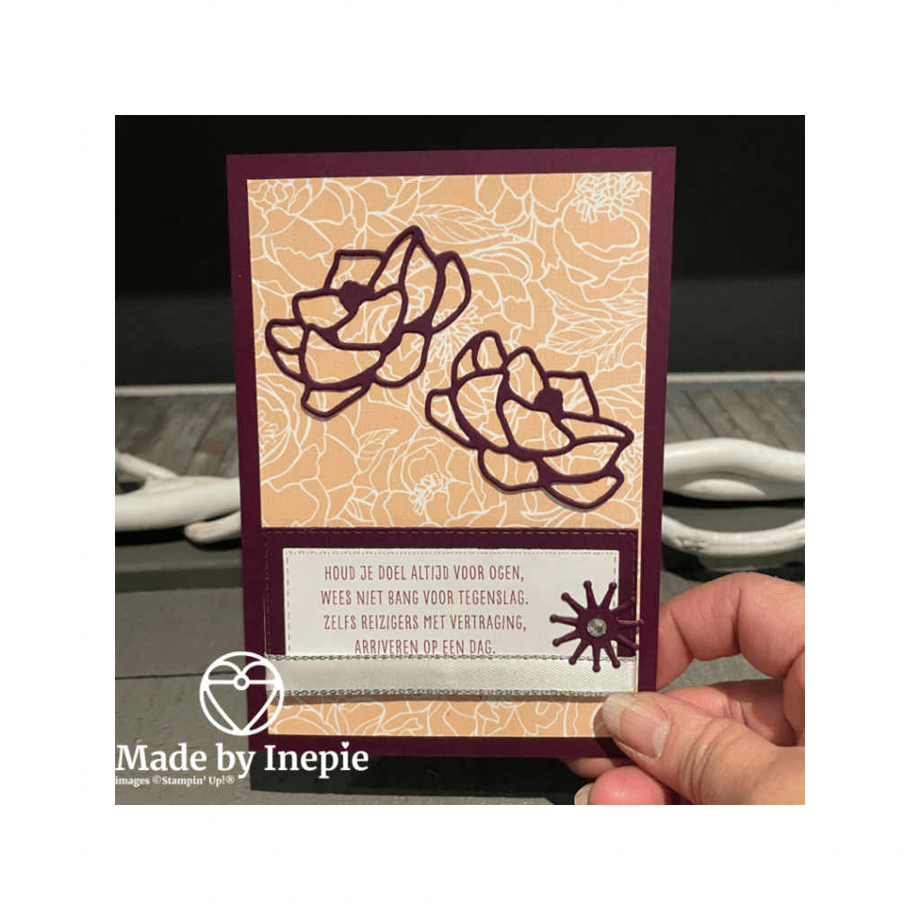 De basiskaart is in Blackberry Bliss hier bovenop een stuk Peony Garden Dsp en daarop wat uitgestanste bloemen met de Magnolia Memory Dies. De Prized Peony bundel heb ik namelijk niet. Tja ik zou wel willen maar mijn bankrekening niet haha. Soms moet je als demonstratrice ook keuzes maken. En het Dsp vond ik super mooi dus heb ik die wel gekocht.