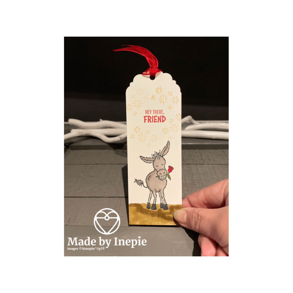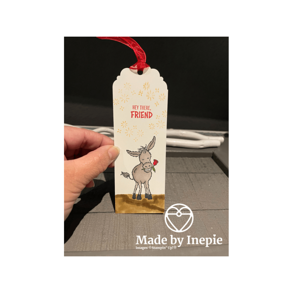 Dus gauw een strook van 2” gesneden uit Whisper White. En met mijn Delightful Tag Topper pons een mooi label gemaakt. Ik heb de schattige ezel gebruikt. Eerst met memento inkt gestempeld en daarna ingekleurd met mijn Stampin Blends.