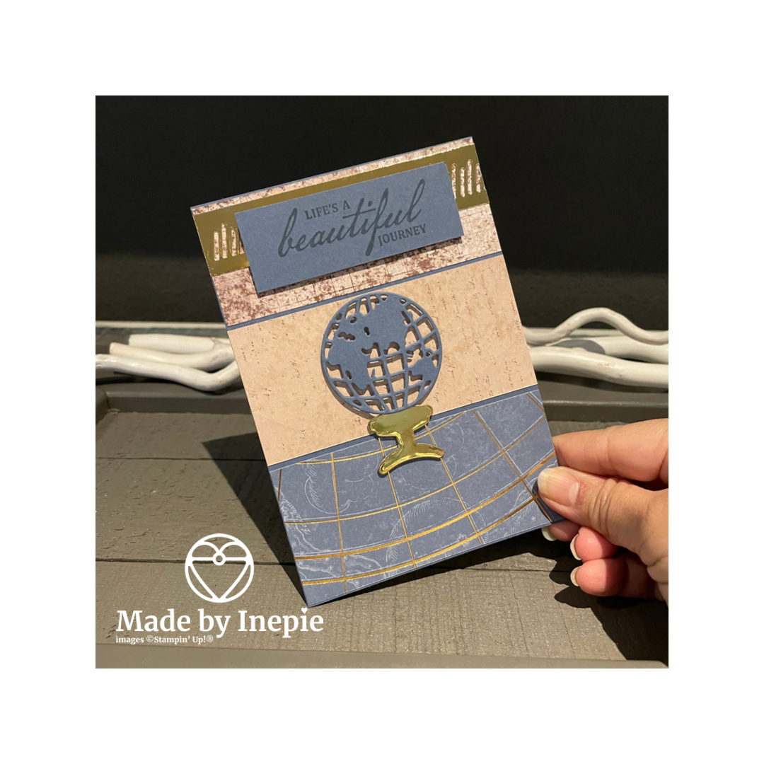 Ik had nog rest stukjes van het prachtige World of Good specialty Dsp over van de kaart voor Michael dus daar heb ik deze stoere mannenkaart mee gemaakt. Gewoon stroken op maat gesneden. De wereldbol in Misty Moonlight cardstock uitgestanst. De voet uit goud folie uitgestanst. En ook de strip. De tekst komt uit de bijbehorende stempelset Beautiful World. En heb ik met Misty Moonlight inkt gestempeld op een restje Misty Moonlight Cardstock en opgeplakt met Dimensionals.