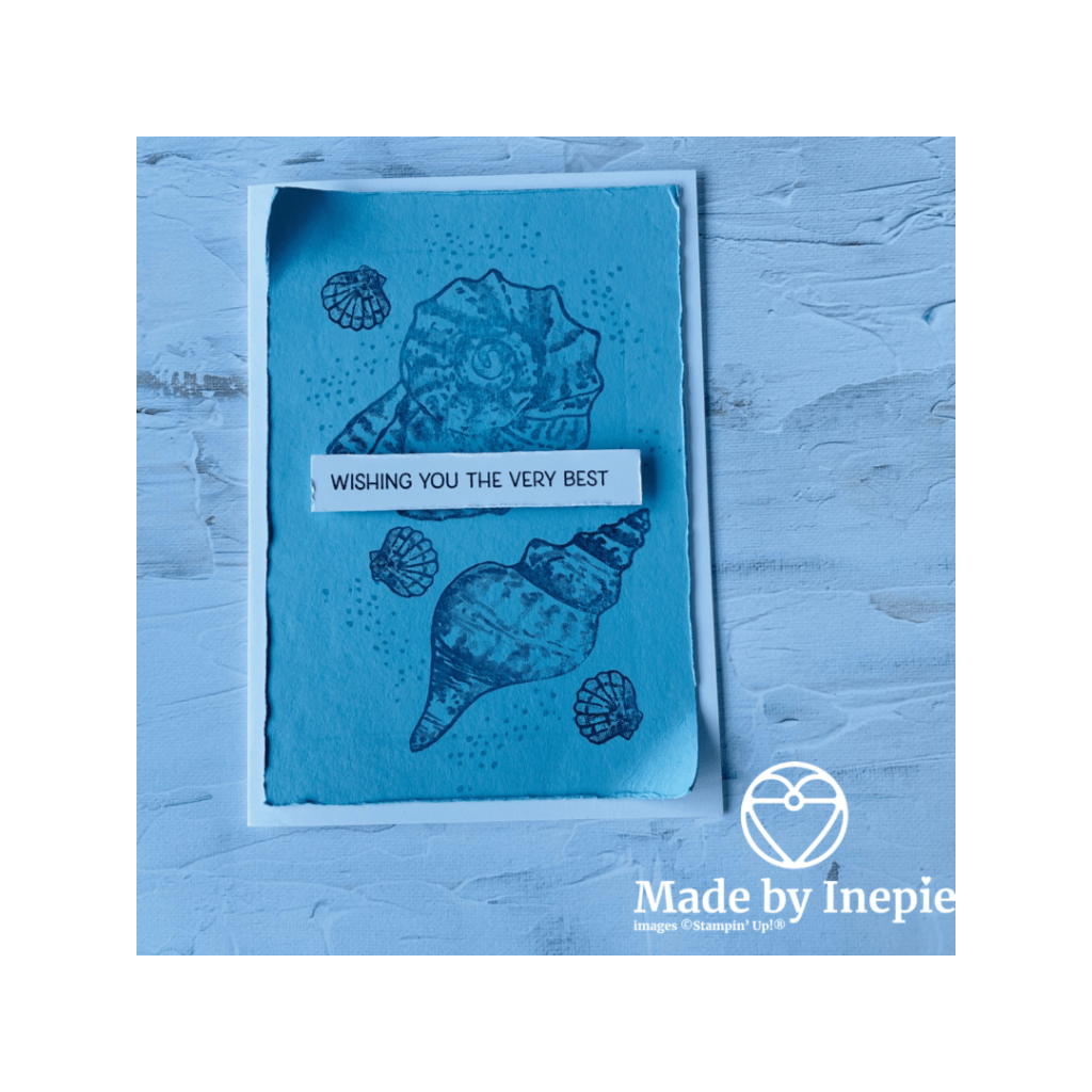 Ik heb de tekst op een stukje Basic White gestempeld met Pacific Point. En ook deze randen behandeld met mijn dopje. Met Dimensionals opgeplakt. En zo heb je snel een mooie kaart gemaakt. Als je de stempelset koopt samen met de Seaside Seashells stansen krijg je 10% korting en kost de bundel €64,75 dat betekent dat je nu tijdens Sale-A-Brations er meteen een gratis product bij mag uitzoeken. Gratis een stempelset of een pak Dsp krijgen? Wie wil dat nu niet. Ik help jou graag met je bestelling op madebyinepie@gmail.com
