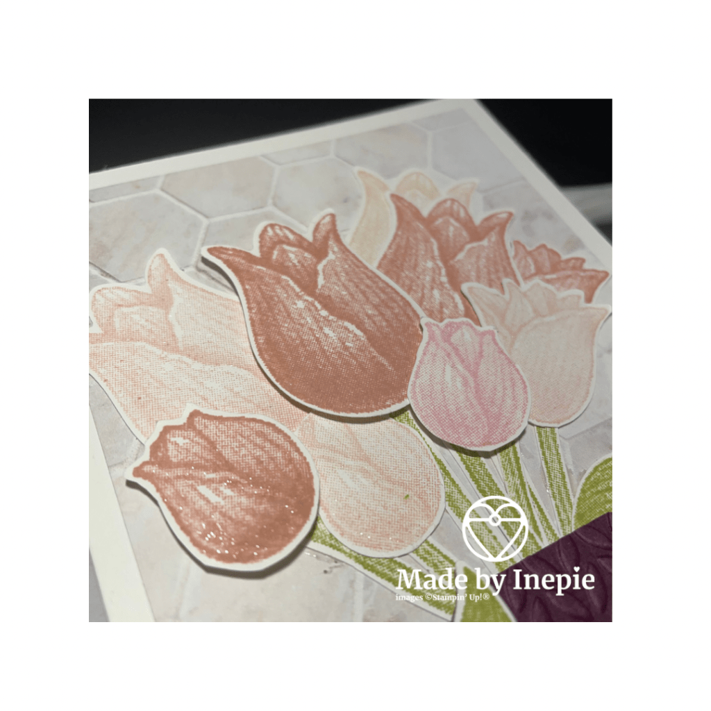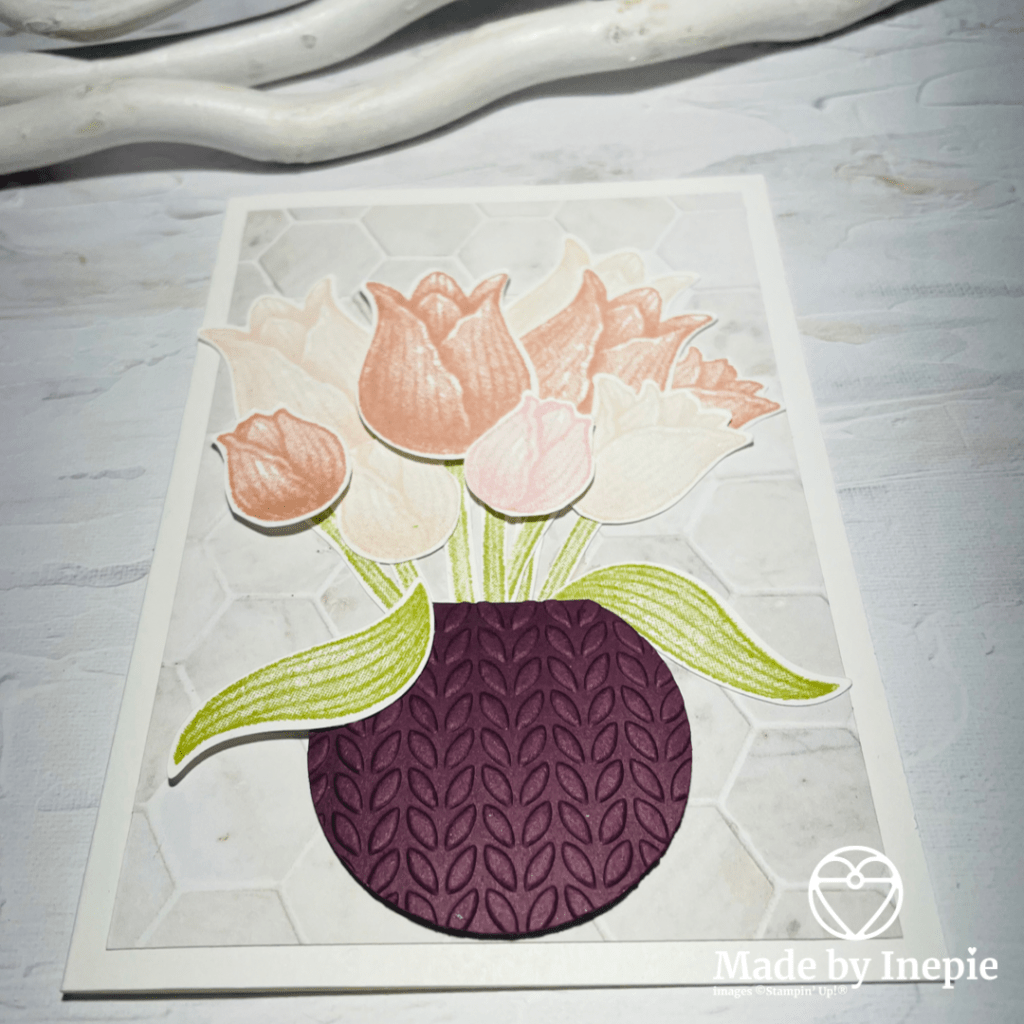 Van een reststukje Blackberry Bliss cardstock maakte ik de vaas door met een 2″ cirkel pons een cirkel uit te ponsen. En deze door de Greenery embossing folder te halen. Gaaf toch? De tulpen heb ik met liquid Glue en soms met dimensionals opgeplakt. Ik heb op de tulpen nog wat Wink of Stella gedaan maar dat is altijd moeilijk te zien op een foto.