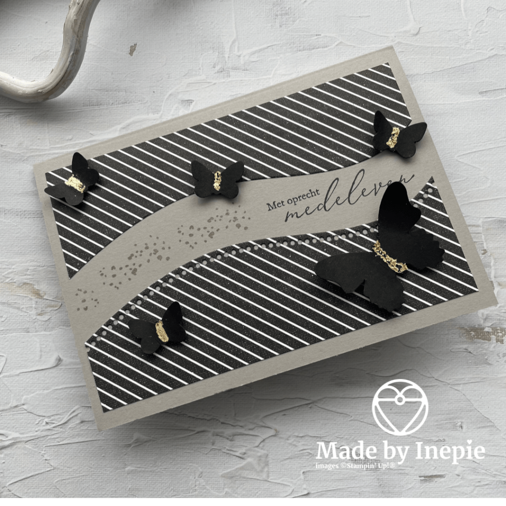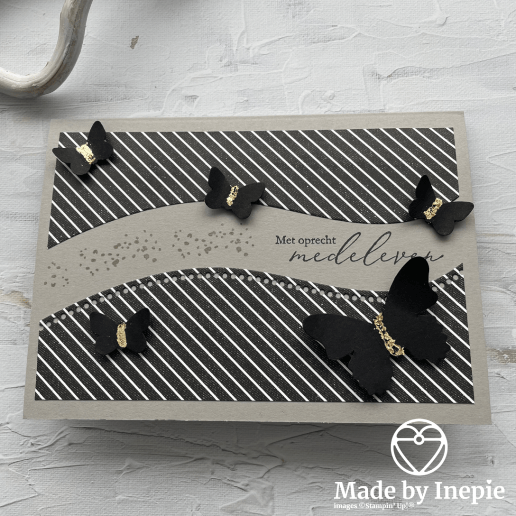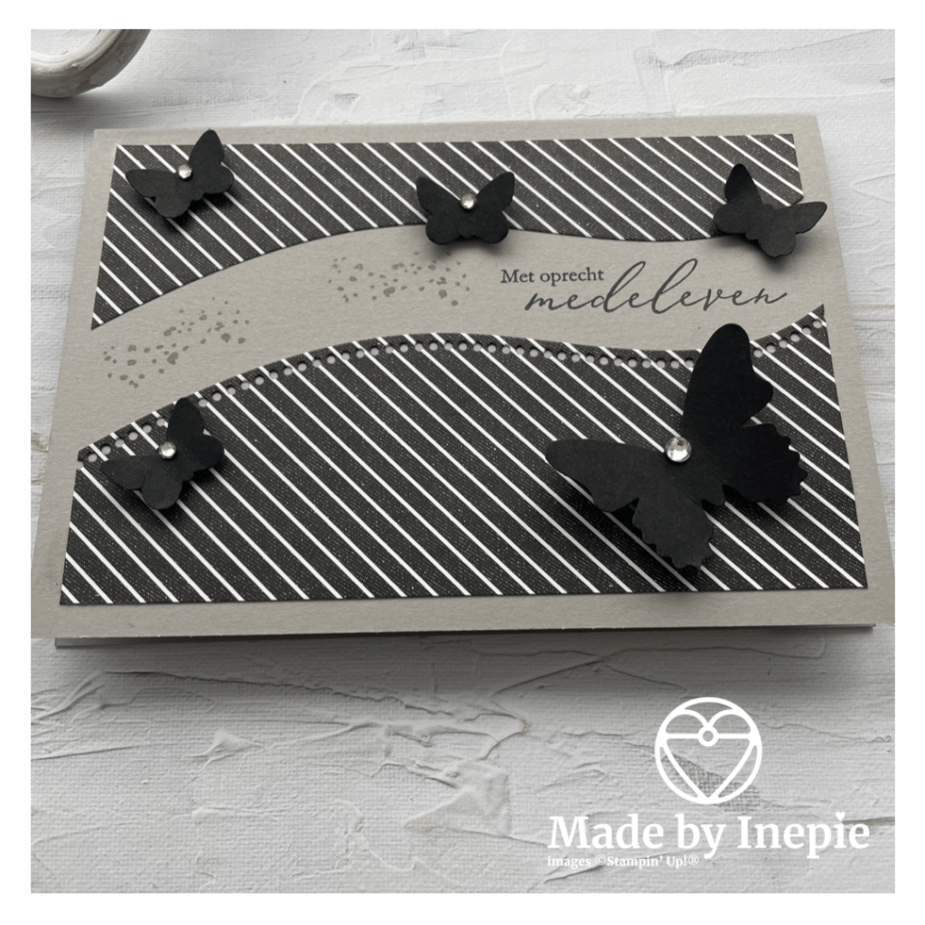 Hiervoor heb ik de Curvy Dies gebruikt. En het mooie zwart witte True Love Dsp uit de minicatalogus. De vlinders heb ik geponst met de Butterfly Duet pons uit Basic Black cardstock. De mooie tekst komt uit de gratis stempelset Hartverwarmend die je deze maand nog mag uitzoeken bij een bestelling van €60,00. Voor de Bling Bling heb ik Basic Rhinestones gebruikt en het stippeltjes stempeltje komt uit een andere gratis stempelset A Touch Of Ink. Deze mooie set kun je uitzoeken bij een bestelling van €120,00 maar hij is dan ook prachtig.