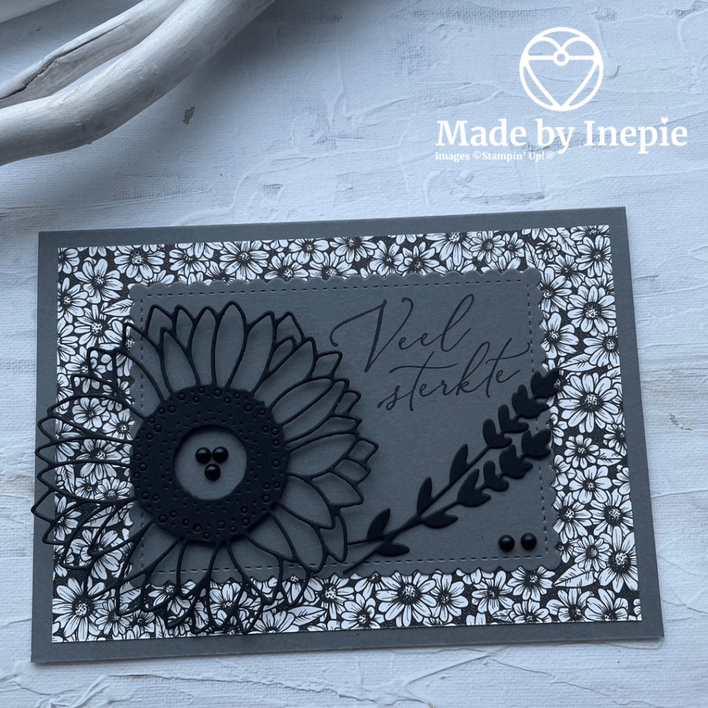 Vandaag voor Dies Dinsdag een rouwkaart. Wie mijn blog volgt en mijn laatste YouTube filmpje heeft gezien van de Hot Dog kaart, ziet dat ik ook hier het zelfde principe heb gebruikt als de kaarten met de hondjes en de slakjes. Ik heb de kaart wel even laten zien in het filmpje maar nu heb ik ook alle gebruikte materialen hier neer gezet. Basis kaart ( Basic Gray), Dsp mat, cardstock uitgestanste( Stitched So Sweetly Dies) mat en tekst. De tekst komt uit de Nederlandse set Hartverwarmend. Deze teksten zijn echt heel mooi. De bloem is gestanst met de Sunflowers Dies en daar komen ook de takjes uit. Het Dsp is uit het mooie zwart witte True Love Dsp.