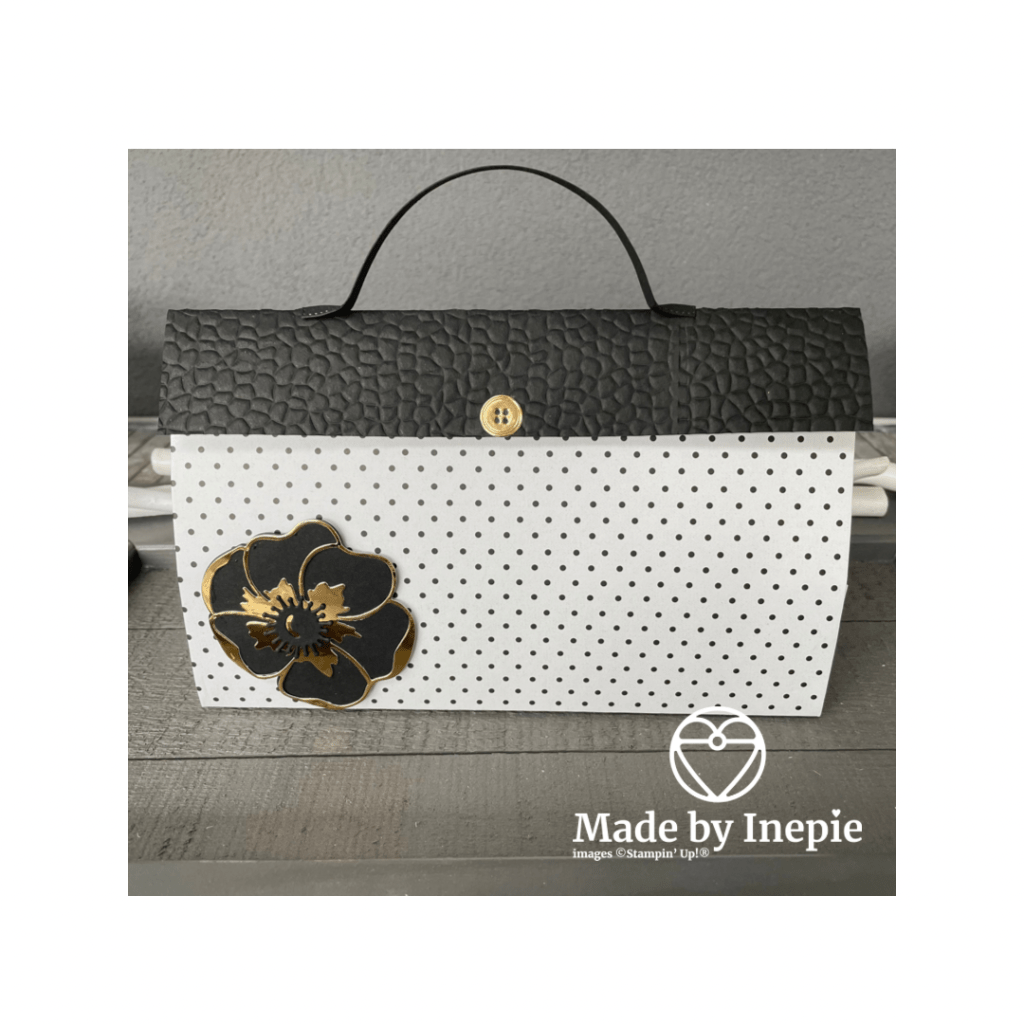 Ik heb het mooie zwart witte True Love dsp gebruikt en een stuk zwart cardstock wat ik eerst door de Hammered Metal Embossing folder heb gehaald. Zo lijkt het wat op leer. Het handvat en het knoopje komen uit de All Dressed Up Dies. En de bloem is gemaakt met de Poppy Moments Dies. Is het geen plaatje?