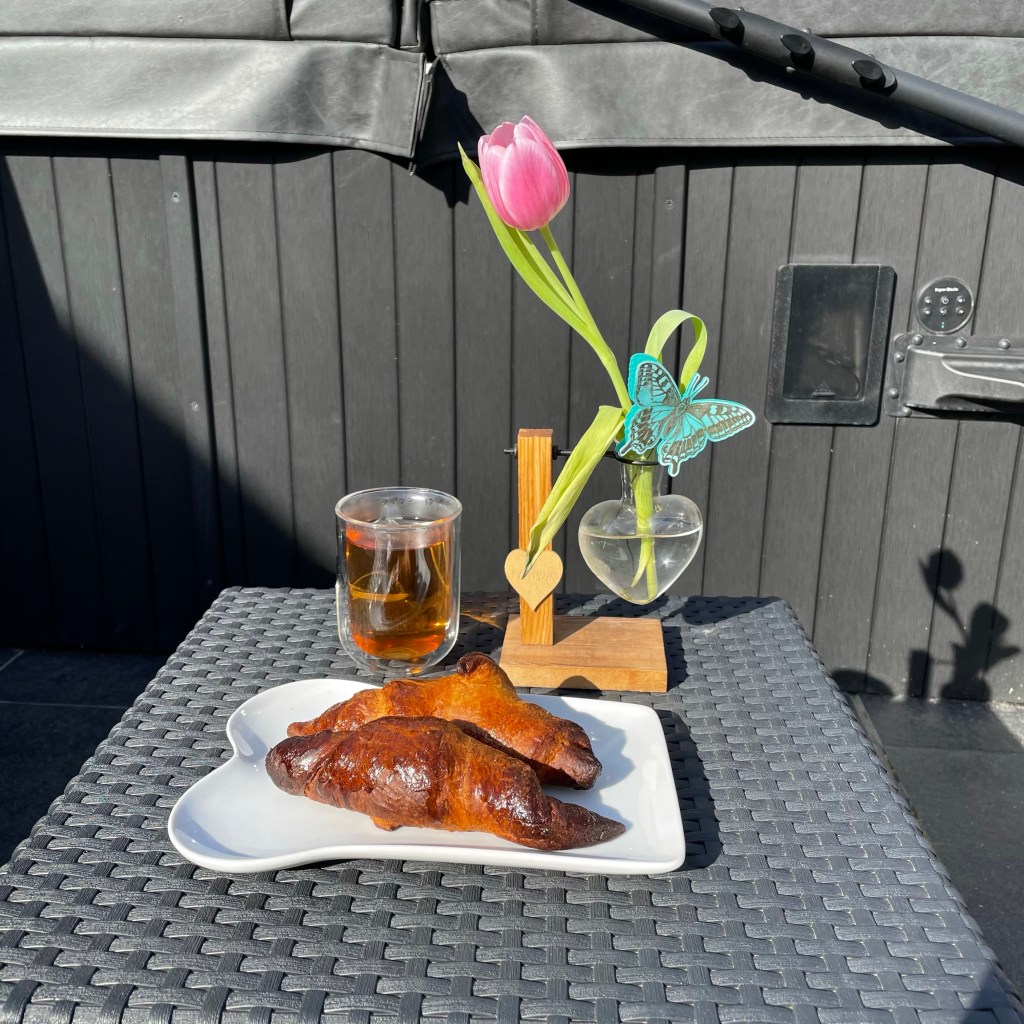Oh wat een cadeautje: brunchen in de zon. Heerlijke croissantjes met liefde gemaakt door mijn Willem. Kopje thee en natuurlijk een vaasje met een tulp.