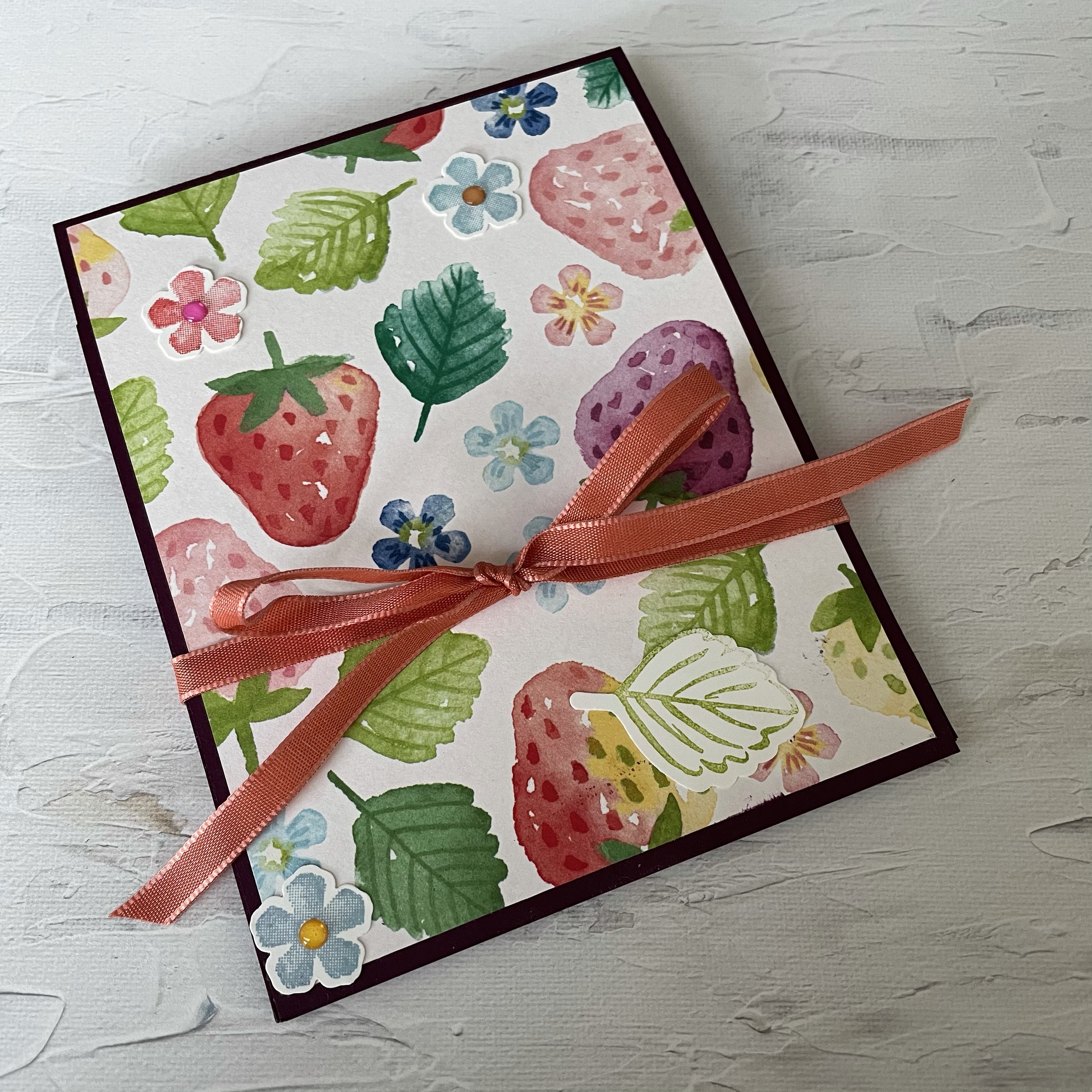 Ik heb het mooie gratis Berry Blessings Dsp gebruikt die je samen met de stempelset Berry Blessings mag uitzoeken bij een bestelling van €120,00. Echt zo mooi! De Strawberry Builder Punch en de stempelset Sweet Strawberry passen hier perfect bij.