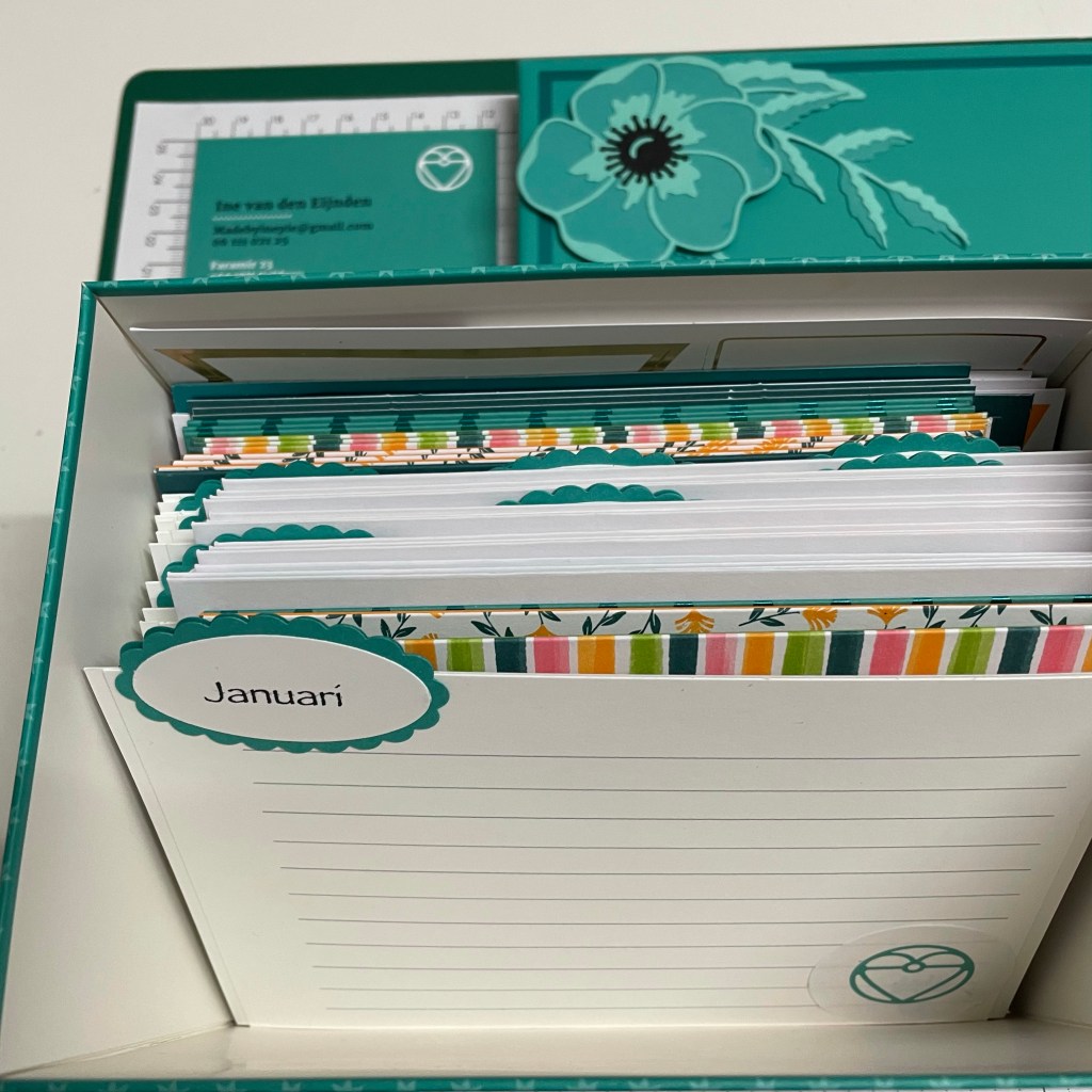 Het is nu een kaarten bak geworden zodat ik per maand verjaardags kaarten of jubileum kaarten erin kan doen. Ik schrijf dan per maand de verjaardagen op het kaartje en stop ze dan daarachter in de doos.