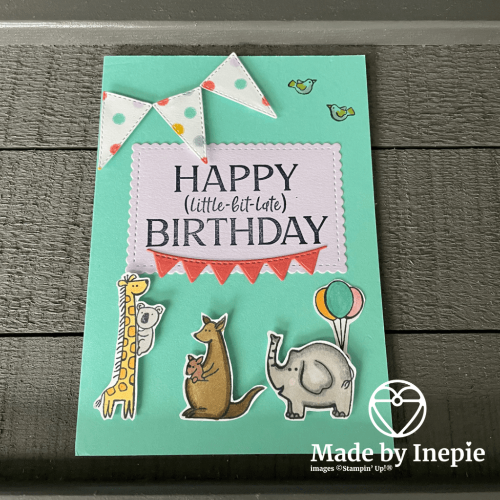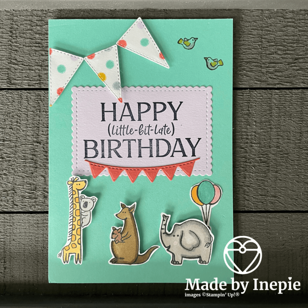 Ik wist meteen welke sketch ik ging gebruiken. Want De Stitched triangels Dies heb ik te weinig gebruikt. De schattige diertjes komen uit de set Zoo Globe. Ik heb ze ingekleurd met de Stampin Blends. Echt zo’n bijna vergeten set, terwijl je er ook schattige geboortekaartjes mee kunt maken. En van de stempelset Happiest of Birthdays gebruik ik de grote stempel vaak maar deze fijne iets te laat stempel eigenlijk niet. En ook de Stitchesd So Sweetly Dies blijven te vaak in hun hoesje. Omdat ik meestal nu naar de Stitched rectangles grijp, terwijl deze ook zo mooi zijn. Dus een goede uitdaging dez team swap.