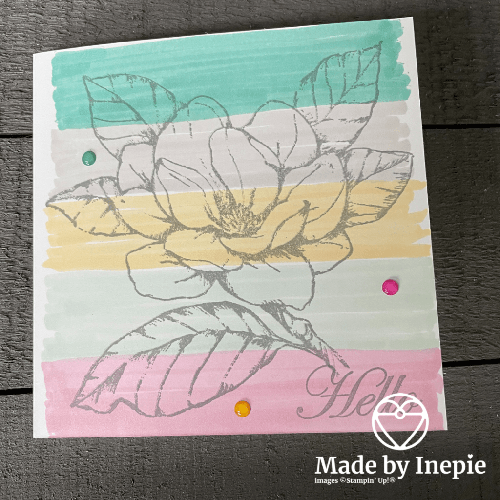 Ik heb de bijbehorende kleuren Stampin Blends erbij gezocht. En dan van allemaal de lichte versie. En op een kaart Whisper White van 21 cm bij 21 cm ( score op 10,5cm heb ik gewoon strepen gemaakt van 2 cm breed ongeveer. Gewoon van links naar rechts gekleurd: Easy Peasy. Daarna de mooie grote Magnolia stempel uit de set Goodmorning Magnolia op mijn Stamparatus geplakt en met Smokey Slate inkt gestempeld. En kijk hoe leuk: