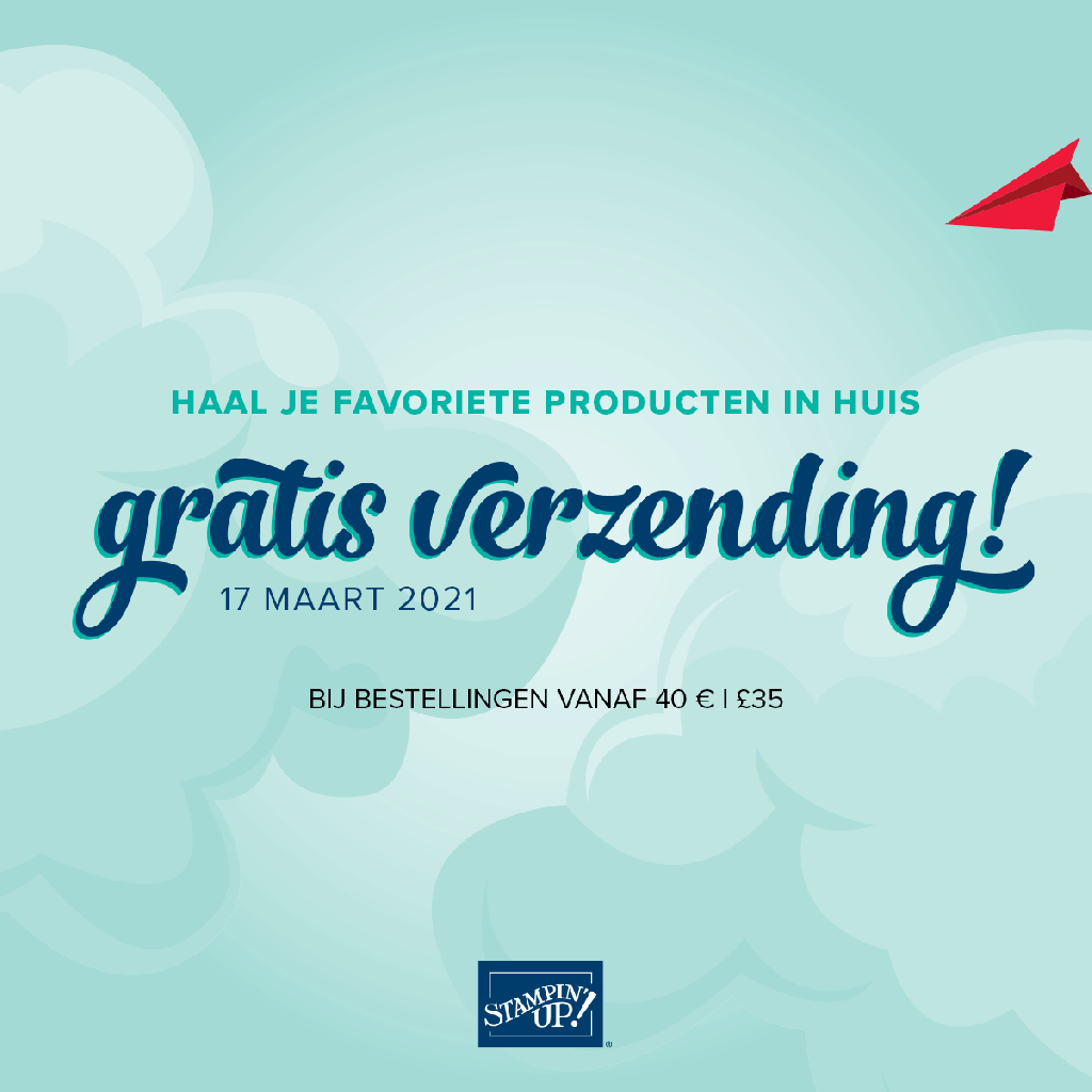 Morgen heeft Stampin’ Up! een geweldige actie: alleen die dag geen verzendkosten bij een bestelling vanaf €40,00. Dat scheelt toch mooi weer. Ik ga zeker bestellen en jij? Wil jij een bestelling plaatsen kan dit op madebyinepie@gmail.com
