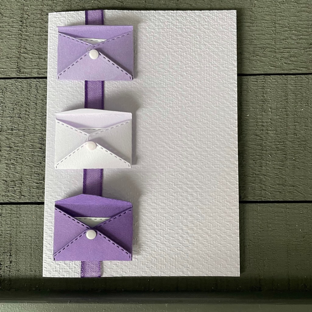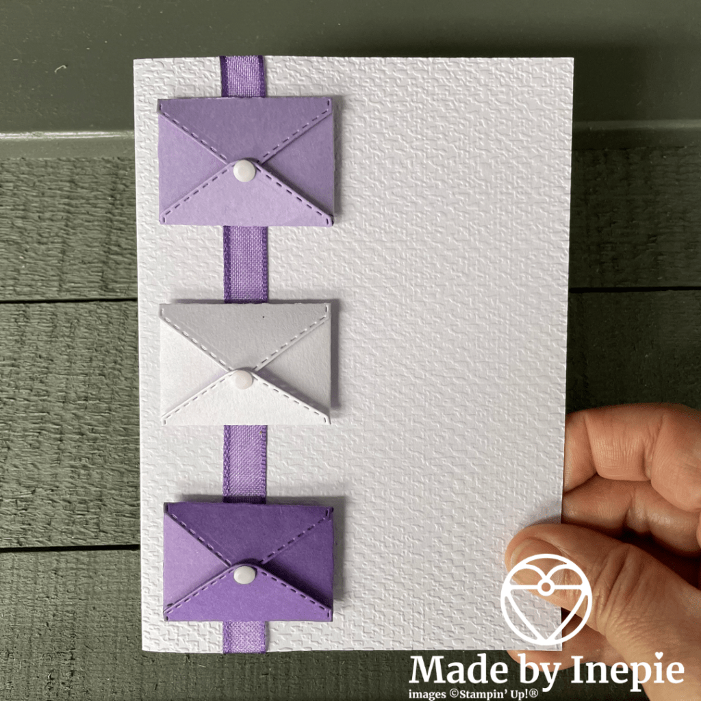 En de kaart in Purple Posy heb ik eerst ge-embossed met de Tasteful Textile 3D Embossing Folder. Nog het reststukje lint gebruikt en wat Enamel dots en dit kaartje is klaar. Lief toch?