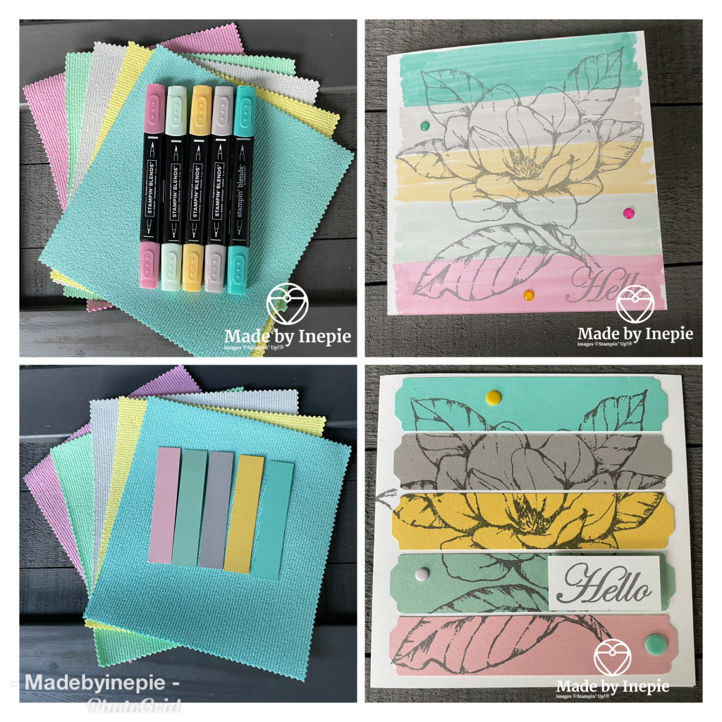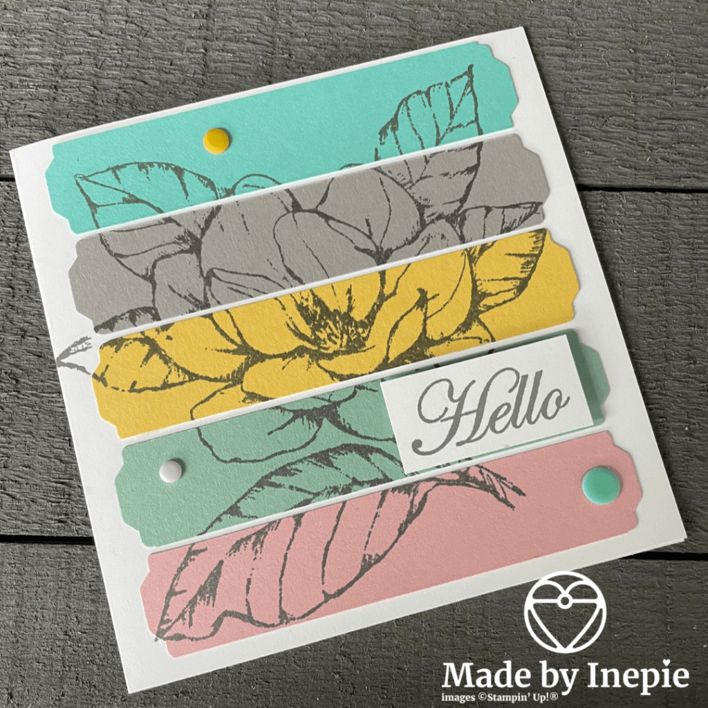 Maandag liet ik hier mijn nieuwe poetsdoekjes zien en hoe mij dat inspireerde voor het makkelijke kaartje met de Stampin Blends. Vandaag ben ik in mijn restjes bak gedoken en heb strookjes cardstock in dezelfde kleuren gesneden op 1,9 cm bij 10 cm. Omdat 1,9 cm een maat is die precies in de Lovely Labels Pick a Punch past.