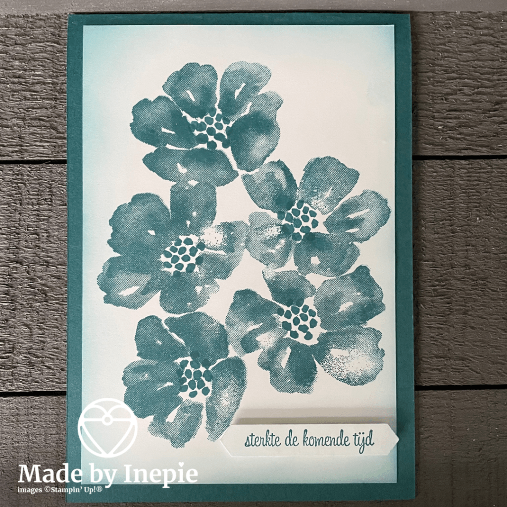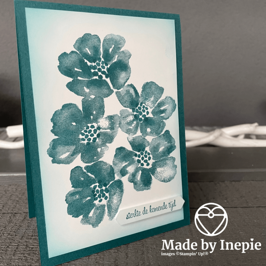 Het Makkelijke Maandag Kaartje is dus ook in Pretty Peacock. Ik heb de grote stempel van Blossoms in Bloom op een blad van mijn Stamparatus gedaan en op een mat van Basic White gestempeld met Pretty Peacock inkt. De hartjes van de bloemen heb ik met de hand gestempeld. En de randen heb ik met inkt en een Blending Brush een kleurtje gegeven. Dit geplakt op een basiskaart in Pretty Peacock , een tekst erbij uit de Van Alles Wat Stempelset en mijn kaartje is klaar.