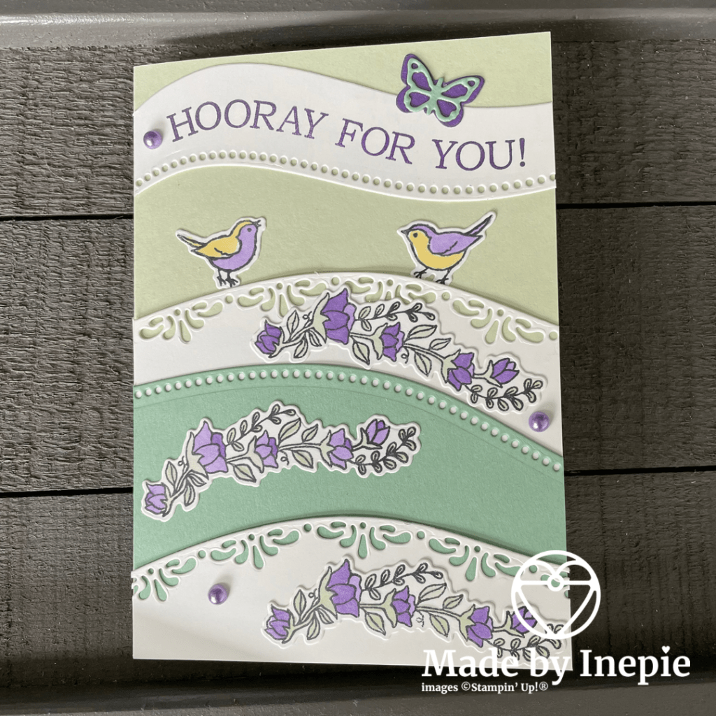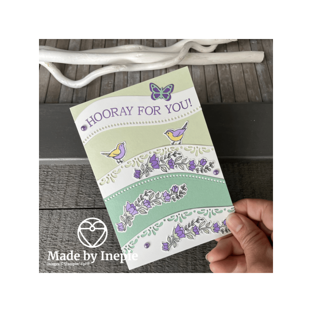 Het is een echte lente kaart geworden met deze zachte groene en lila kleurtjes. En leuk zo met die bogen. Helaas komt deze bundel niet meer terug in de nieuwe catalogus dus wil je deze nog hebben dan moet je hem snel bestellen op madebyinepie@gmail.com. En de stempelset van gisteren Floral Essence is nu in de aanbieding voor € 16,80 Er gaan mooie sets weg maar gelukkig komt er ook veel moois voor terug.