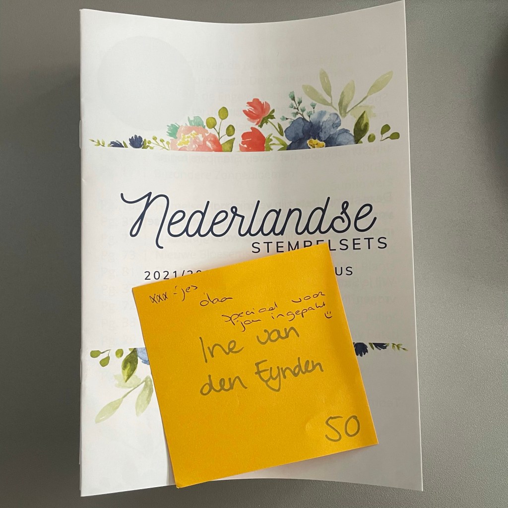 Vandaag kreeg ik de Brochures binnen met alle Nederlandse Stempelsets. Dat vinden wij voor onze klanten fijner en hebben we als team besteld. En hoe leuk is het dan als jouw lief vriendinnetje er een leuk briefje bij doet tijdens het inpakken.