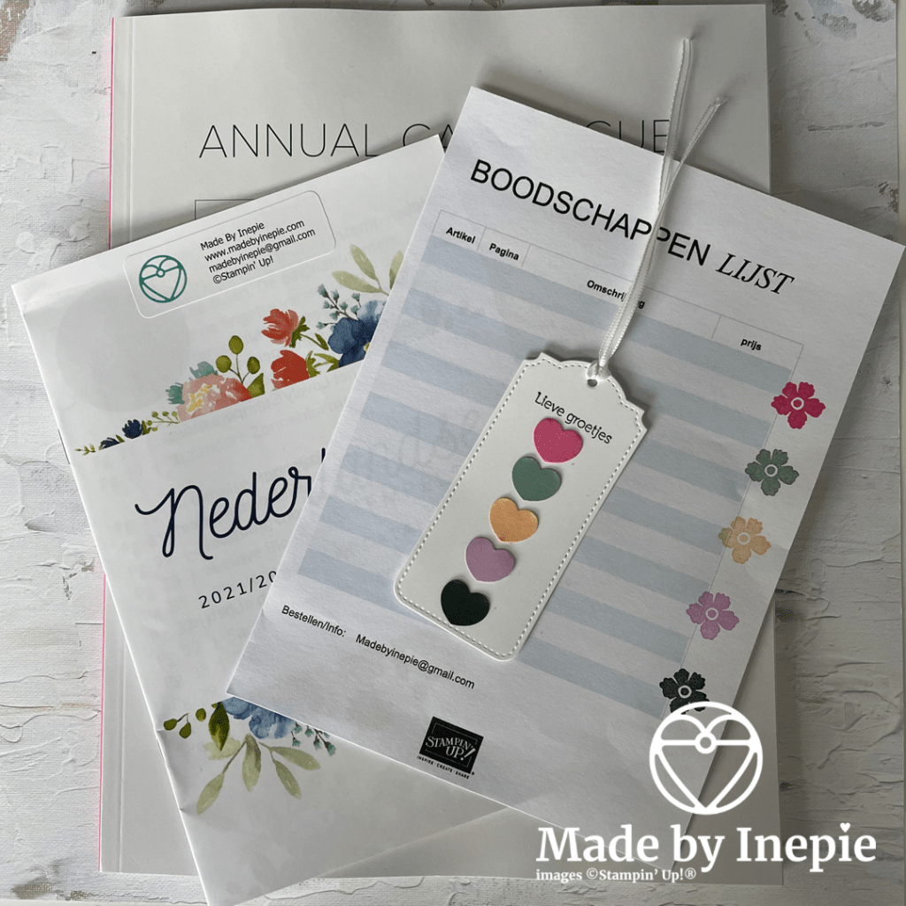 Dit is het workshop pakket geworden: de nieuwe jaarcatalogus, de Nederlandse Stempelsets brochure, een boodschappen lijstje bestempeld met de nieuwe In Colors. En een schattige Tag gemaakt met de nieuwe stansen set: Tailor Made Tags Dies. Dit is de grootste maat van 1 model en er zit nog een hele set in van een ander model. Super gaaf. Deze set ga ik vaak gebruiken.
