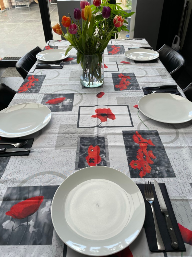 De tafel is gezellig gedekt. Ik ben zo verliefd op dit tafelkleed dat ik vorig jaar in het witte dorp heb gekocht. Want de Painted Poppies stempelset vind ik ook geweldig. En natuurlijk even de vaas met (Tijdloze) tulpen erop gezet. Met het zonnetje buiten lijkt het bijna op lente binnen.