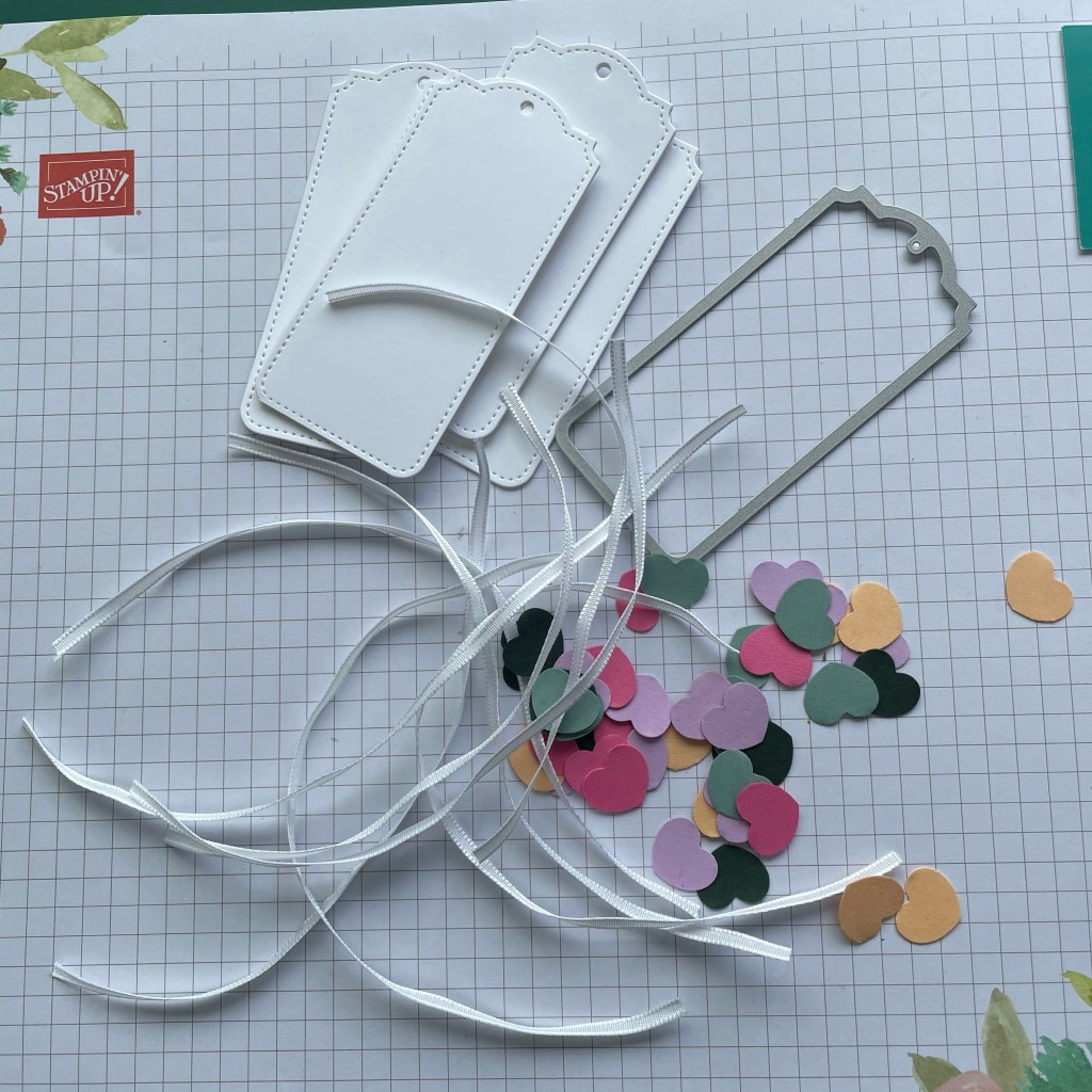 Op de tag de tekst Lieve groetjes en 5 hartjes geponst uit het nieuwe In Colors cardstock. Prachtig hoe ze ook bij elkaar passen. Normaal doe ik een kaart ipv de tag maar zoals ik al eerder schreef moet ik ook op de kleintjes letten. En je kunt de tag ook als boekenlegger gebruiken voor in de catalogus.