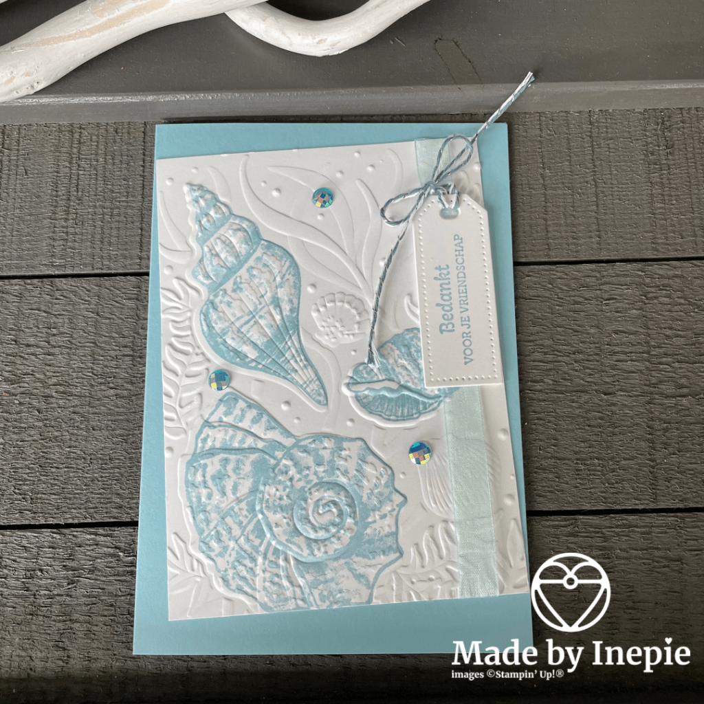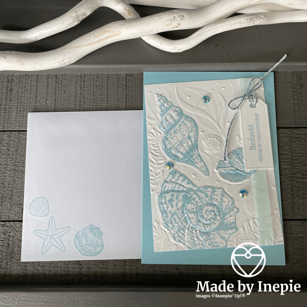 Ik heb eerst op een stuk Basic White cardstock met mijn Stamparatus de 3 grote schelpen uit de Freinds Are Like Seashells set gestempeld in Balmy Blue inkt. Daarna dit stuk cardstock ge-embossed met de Seashells 3D Embossing folder. Wat een prachtig effect! En daarna het stuk bijgesneden en een stuk lint aan de zijkant erop geplakt. Toen het wat schuin op de basiskaart van Balmy Blue cardstock geplakt. De tekst komt uit de stempelset Kaartje Van Mij die ons helaas gaat verlaten maar nog wel te bestellen is in mijn onlineshop. Ik heb het uitgestanst met de geweldige nieuwe stansen set Tailor Made Tags Dies ( deze is pas vanaf 4 mei bij mij te bestellen. Super leuk om heel veel verschillende tags te maken. Deze mini tag heb ik vastgemaakt met wat bakers twine en de kaart versierd met de Blue Adhesive Backed Gems voor de Bling Bling. Ik ben helemaal tevreden over deze kaart. De envelop heb ik ook bestempeld.