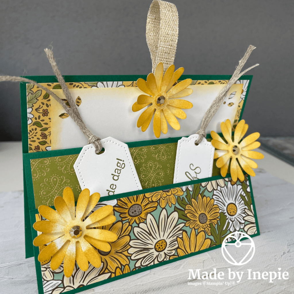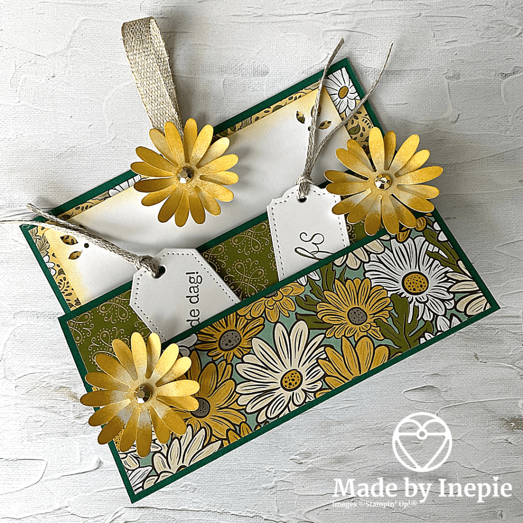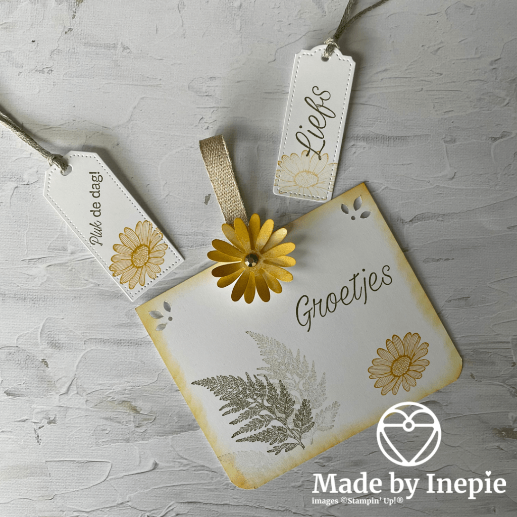 Er is dus ruimte voor een grote kaart waaraan ik een stuk lint heb vastgeniet zodat je het kaartje makkelijk eruit kunt halen. En nog twee kleine tags voor in het voorvakje. Ik heb de set Pluk de Dag gebruikt en de bijbehorende medium Daisy pons en de grote Daisy Pons. Het Dsp wat ik gebruikt heb is het: Ornate Garden Specialty dsp. De ontvangerster was er ook erg blij mee.