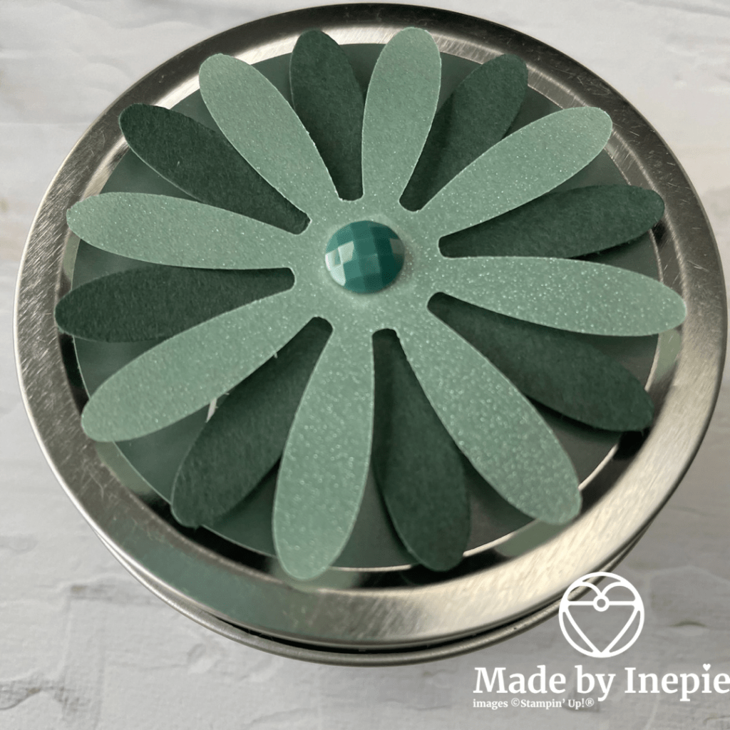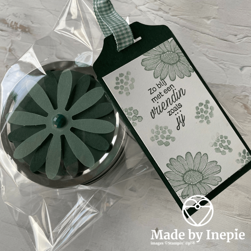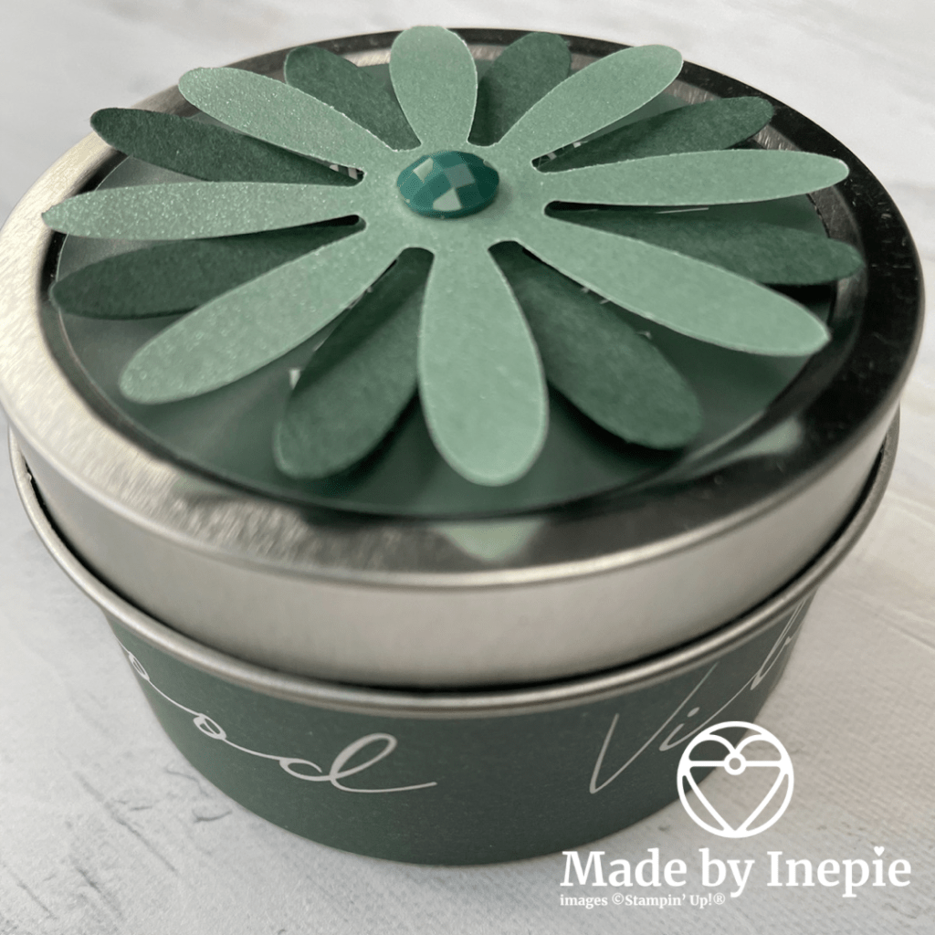 Deze kaarsenblikjes zijn super leuk en ruiken heerlijk en deze paste perfect bij de nieuwe kleuren groen van de nieuwe in colors: Evening Evergreen en Soft Succulent. Ik heb met de Daisy punch uit Evening Evergreen cardstock een bloem gestanst. Daarna uit het prachtige nieuwe glimmer vellum nog een bloem geponst en met Dimensionals op het blikje geplakt. Steentje erop en klaar!