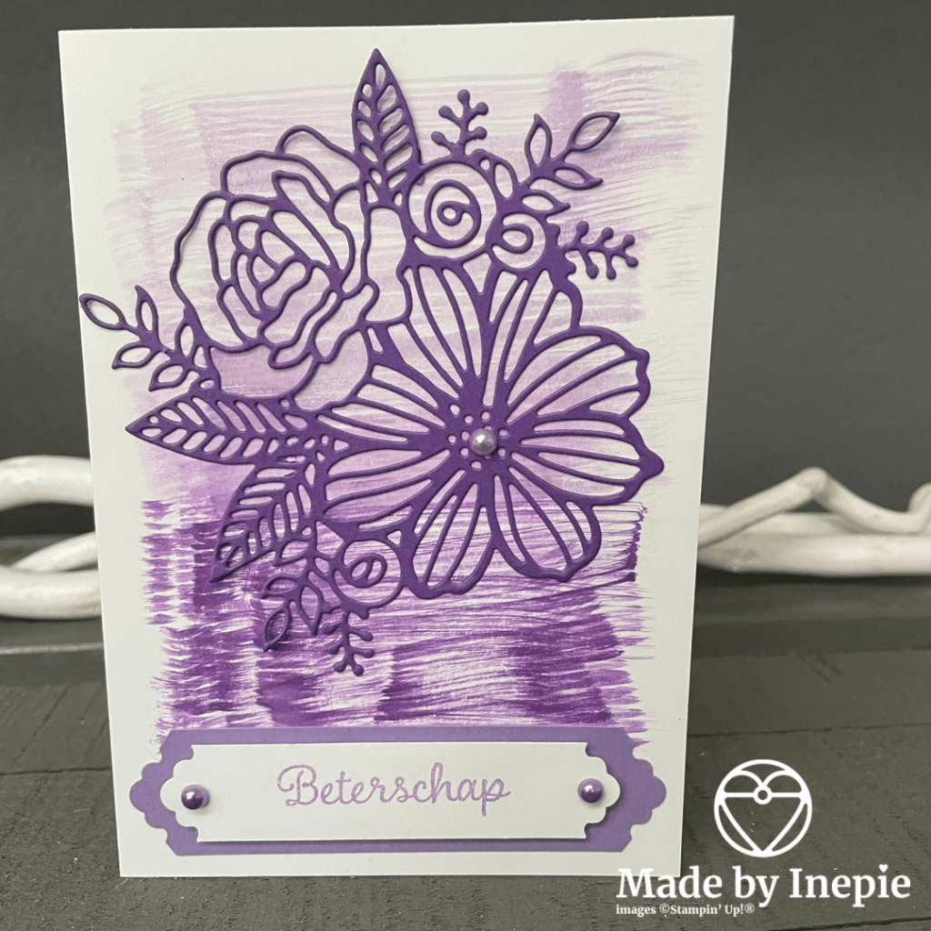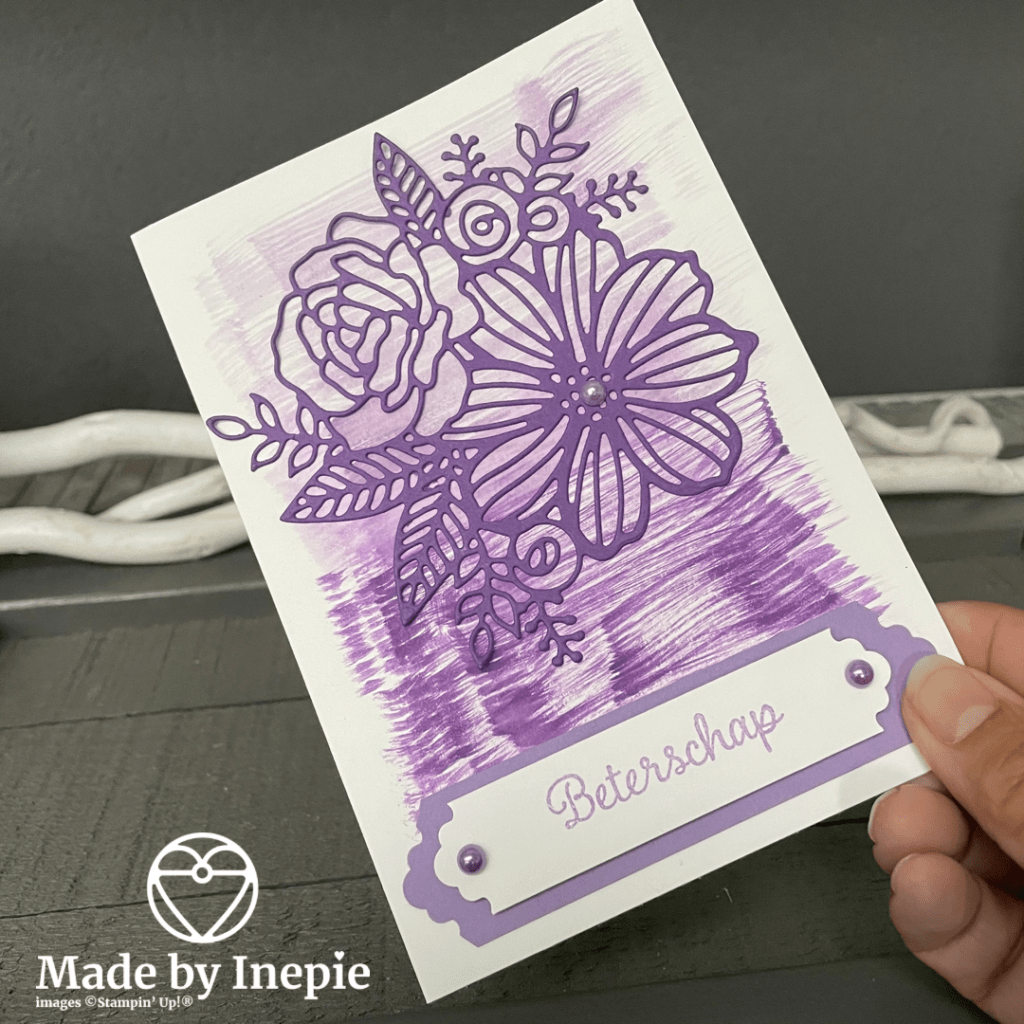 Nu het kaartje van vandaag. Met mijn nieuwe stansen set Artistic Dies heb ik meteen de grote bloem uitgestanst. Uit Gorgeous Grape cardstock. Op een basiskaart van Basic White heb ik met de grootste kwast uit de Water Painters set strepen getrokken met Higland Heather en Gorgeous Grape inkt. Hierop de bloemen stans geplakt.