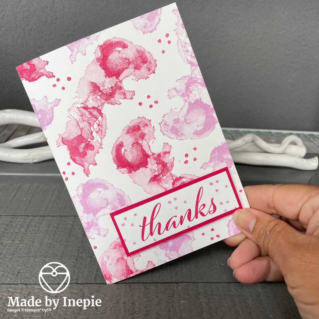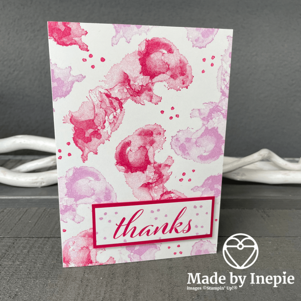 En hoppa opeens heb je een prachtige kaart. Twee kleuren inkt heb ik gebruikt: Melon Mambo en Fresh Freesia. En drie stempels, de grote stempel en de kleinste en de tekst Thanks. Een Basic White basiskaart. Een rest stukje Melon Mambo en een stukje Basic White. Nog wat Dimensionals en thats it! Easy Peasy en wat vind ik hem mooi!