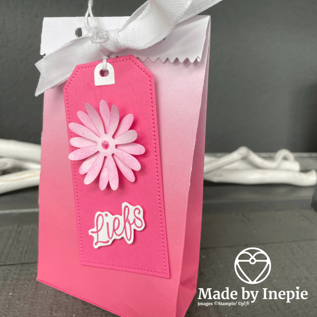 Ik heb bovenin een omslag gemaakt en daar twee gaatjes in gemaakt waardoor ik er een stuk lint doorheen kon halen om het zakje dicht te binden. Daarna met de mooie Tailor Made Tag een mooi label gemaakt. Zo leuk dat je het gaatje kunt versterken met een klein stansje. Voor de versiering heb ik de Pluk de Dag stempelset gebruikt en de medium Daisy pons. Uit Basic White cardstock twee bloemen geponst en deze met de Blendin Brushes en Polished Pink inkt bewerkt. Daarna met Mini Dimensionals de bloemen op elkaar geplakt en op het label bevestigd. Super leuk cadeau tasje geworden toch?