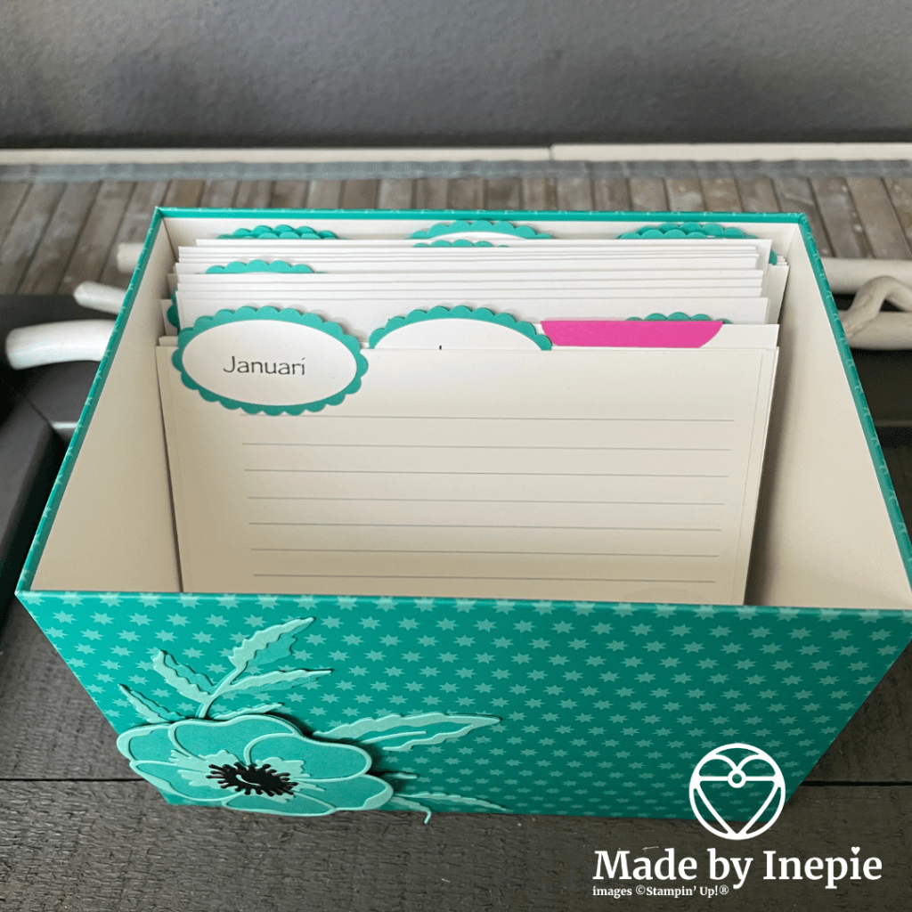 Hij past mooi in het doosje. En zo maak ik voor iedereen een kaartje die die maand jarig is en weet ik ook hoeveel kaarten ik die maand moet maken. Het stukje Magenta Madness steekt goed af bij het Bermuda Bay. Voor mannen maak ik het ovaaltje in Night of Navy. En dan ook met een stempel die bij die persoon past. Super leuk projectje.