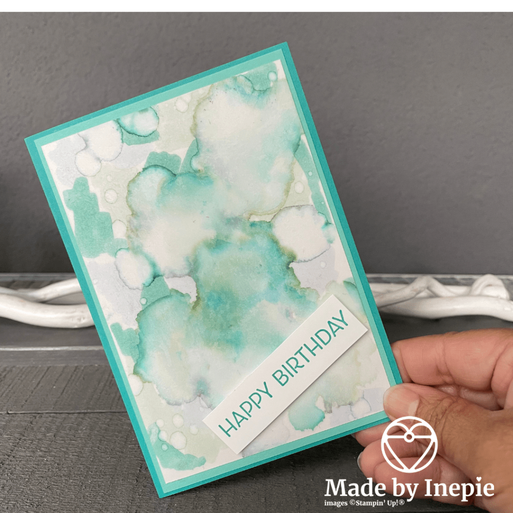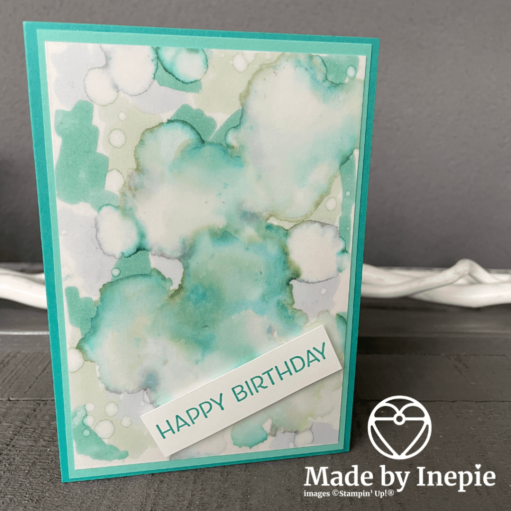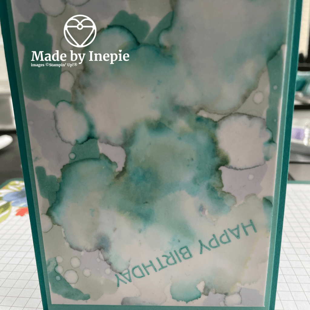 Ik had vooraf al mooie achtergronden gemaakt met de alcohol blending techniek ( zie mijn filmpje op YouTube) en nu dus alleen een tekst toegevoegd: Happy Birthday. En klaar. Maar ik was te enthousiast en stempelde de tekst op zijn kop. Gelukkig makkelijk op te lossen door een nieuwe te stempelen op een stuk Basic White en deze uit te snijden en met Dimensionals er over te plakken.