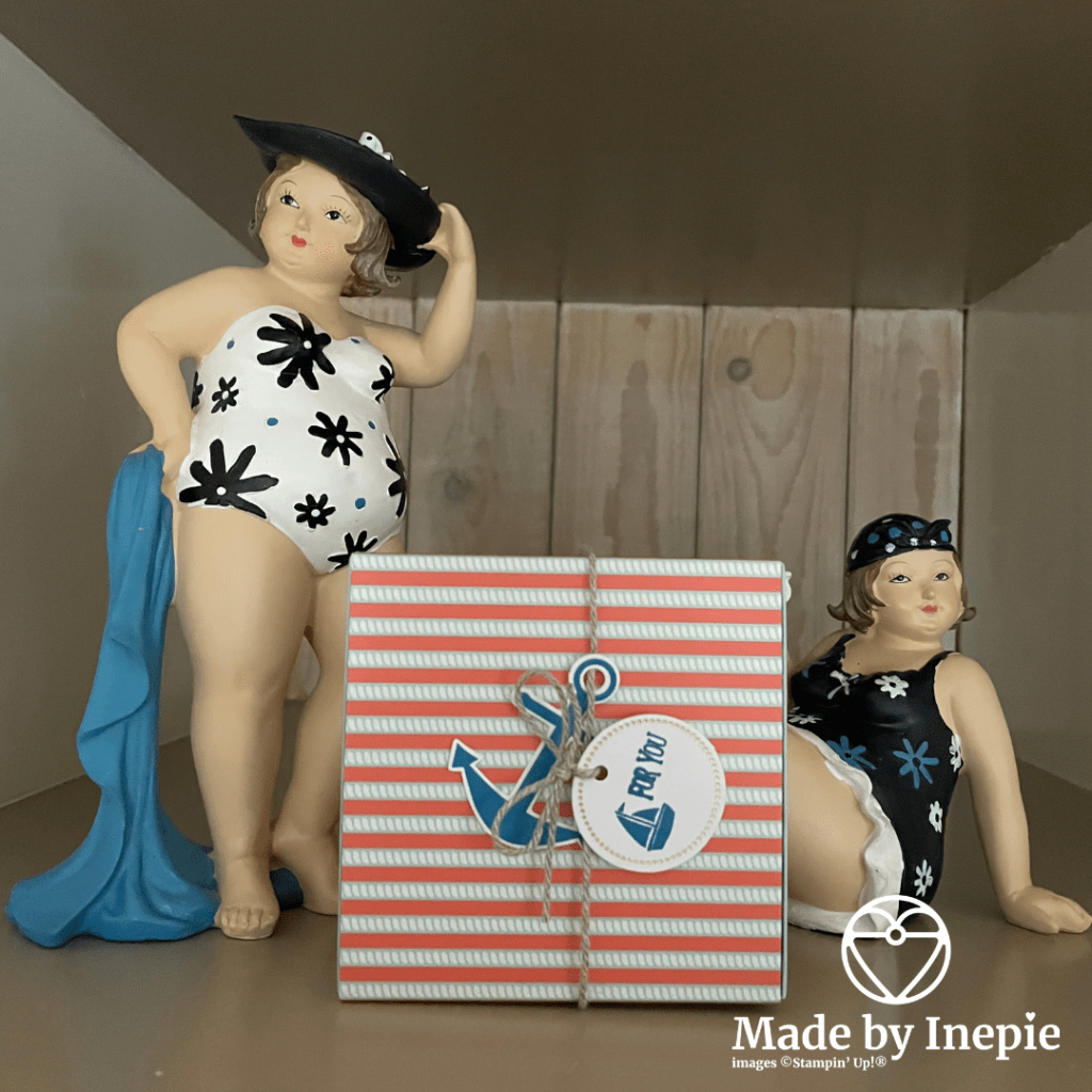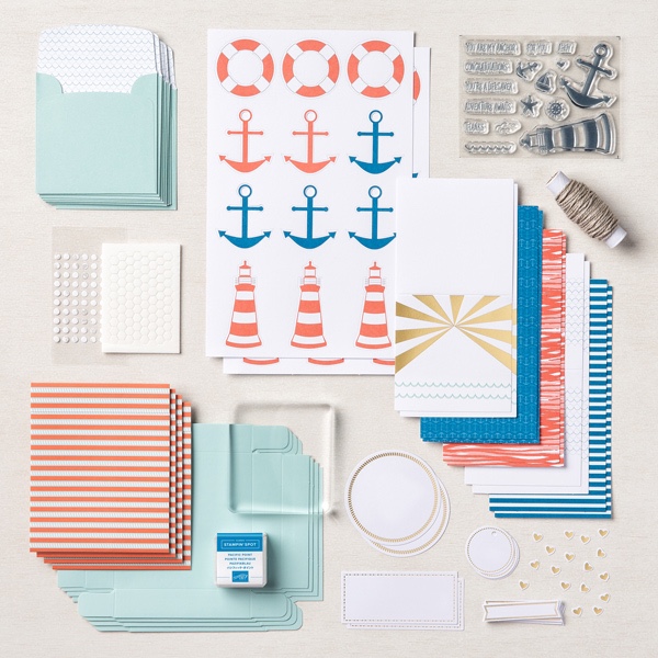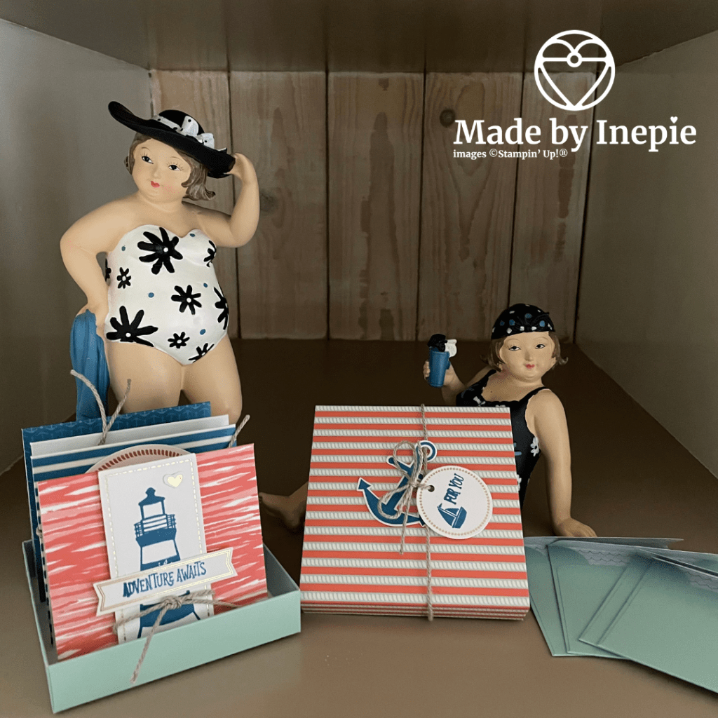 En dit kun je ervan maken: 10 mini kaartjes en 4 doosjes. Deze kit viel mij het eerste op want ik hou van de zee. En omdat ik wist dat we een week weg gingen, naar zee, heb ik deze meegenomen. Zo fijn: je hebt alles bij. Ik neem alleen als extra onze vloeibare lijm mee.