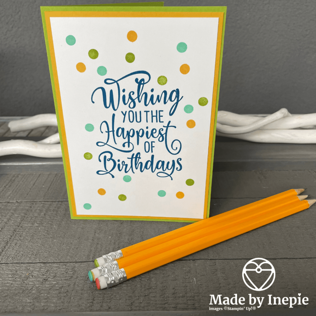 Is dit geen feestelijk kaartje? En super eenvoudig te maken. Ik heb de geweldige stempelset Happiest Of Birthdays gebruikt. Deze heb ik in mijn Stamparatus gedaan en zo hem mooi gestempeld met Pacific Point op een mat van Basic White. En de leuke stippen hoor ik jullie vragen hoe maak je die, nou dat antwoord is simpel met een potlood.