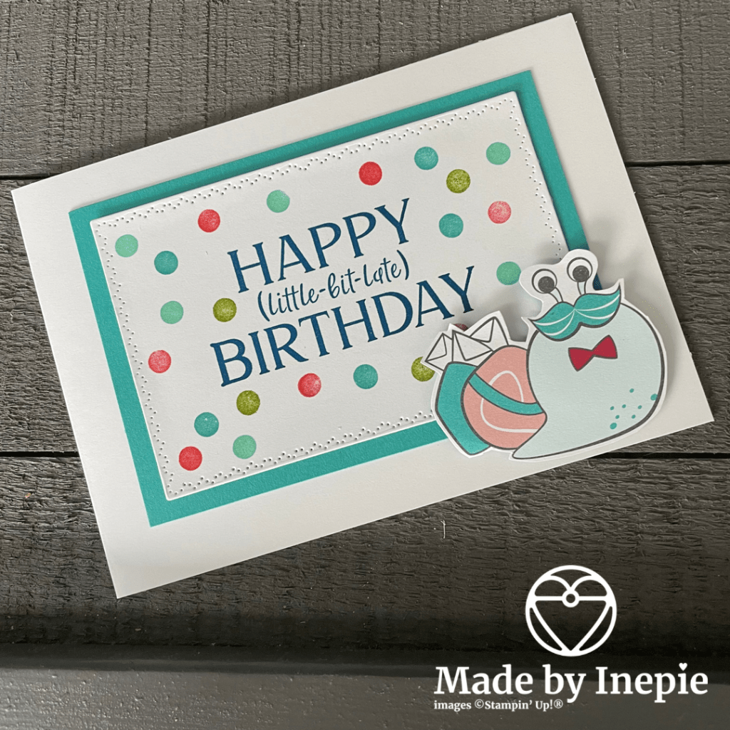 Kijk weer zo’n leukerd. Nu met een andere tekst uit de set: Happiest Of Birthdays. En daarom heen leuke stipjes gemaakt met de potloden. En bij “te laat” denk ik meteen aan slakjes. Dus deze slak uitgeknipt uit het Snail Mail Dsp. De stempelset Snailed It is vanavond vanaf 20.00 uur te koop met 25% korting: € 17,25. En de bijbehorende hartjes ( Resin Hearts) kosten dan maar € 4,25 ( 50% korting). Echt de moeite waard om te kijken wat er in de aanbieding is. Ik zet hier een link naar de Pdf maar dat is zonder foto’s. Vanavond om 20.00 staat het in mijn online shop:https://madebyinepie.stampinup.net/ Ik ga direct bestellen om 20.00 uur want op is op en vooral de producten met 50% korting zullen hard gaan.