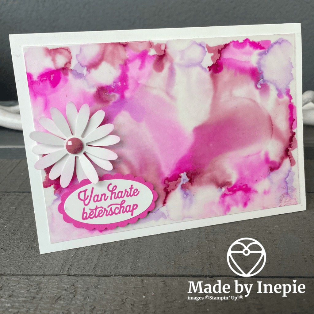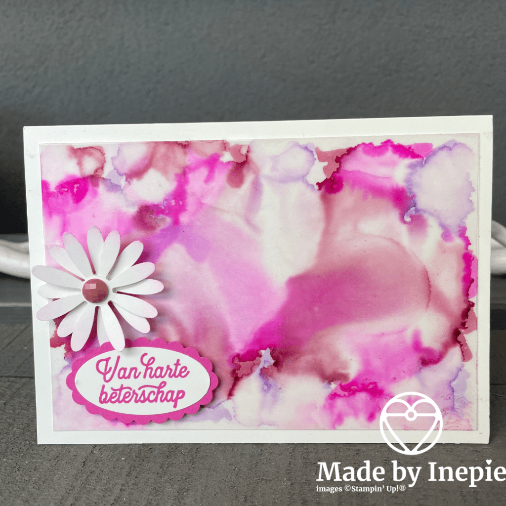 Ik had nog een mooi achtergrondje liggen van mijn alcohol blending techniek. En ik had een beterschaps kaartje nodig dus gauw deze gemaakt.