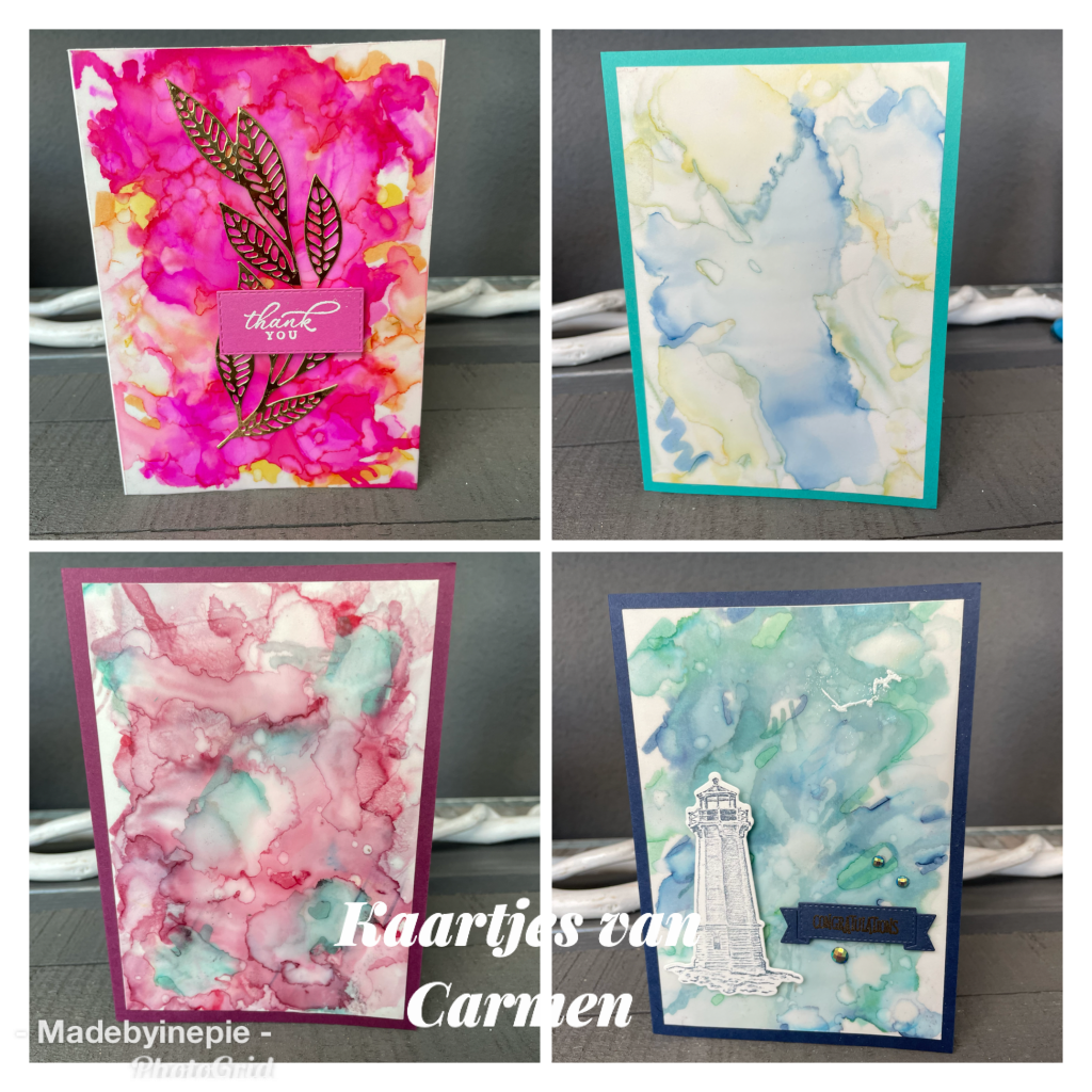 Wil jij ook deze leuke techniek leren vraag dan een vriendin, buurvrouw of familie lid om mee te doen en dan plannen we een datum. De workshop kost €12,50 en je maakt 4 kaarten. De Stampin Blends zijn er in diverse mooie Stampin’ Up! Kleuren en kosten €11,00 per setje ( licht en donkere uitvoering van 1 kleur) en kun je bij mij bestellen via de mail of via mijn webshop. Ook de Vellum kun je bij mij kopen maar voor de alcohol (96%) moet je bij de DA drogist zijn of het Kruitvat.