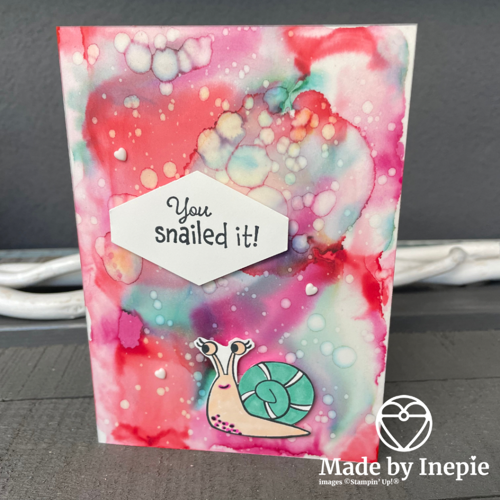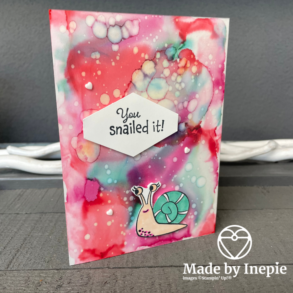 Het achtergrondje had ik gemaakt als voorbeeld tijdens de workshop Alcohol Blending techniek. En de tekst You Snailed it vond ik zeer toepasselijk en ook het slakje omdat haar diploma natuurlijk pas een jaar na het behalen in haar handen kwam.