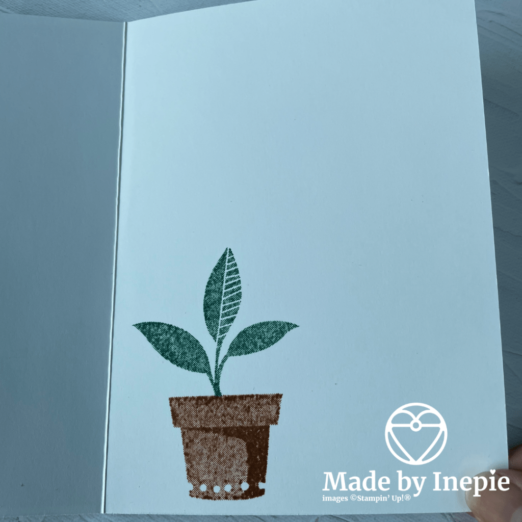 In de binnenkant van de kaart heb ik ook een plant in een pot gestempeld en ook op de envelop. Zo heb je een mooi setje.